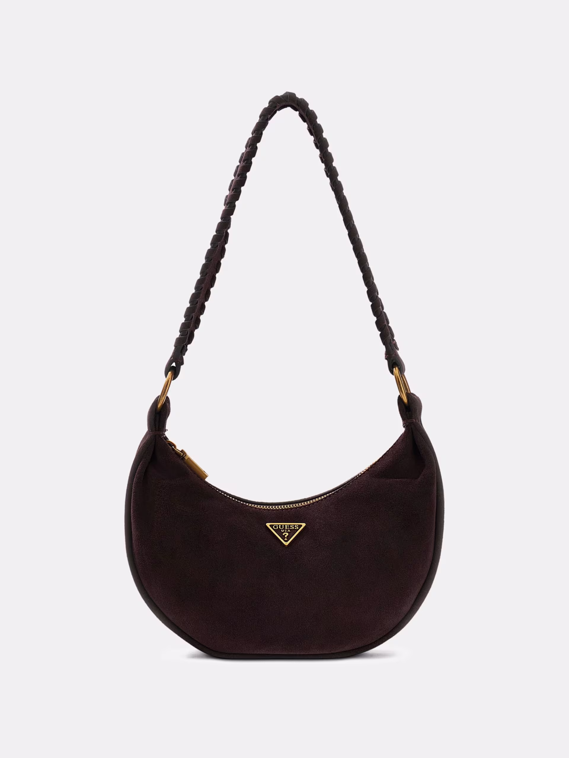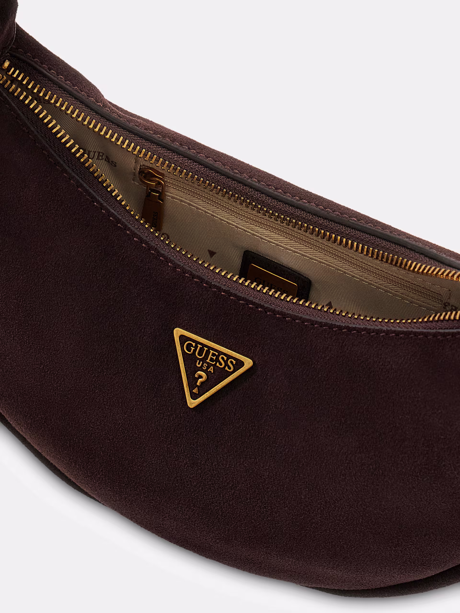 Esterno in vera pelle scamosciata. Chiusura con cerniera lampo. Metalleria color oro. Triangolo logo in metallo frontale. Dimensioni 14 x 24 x 8 cm