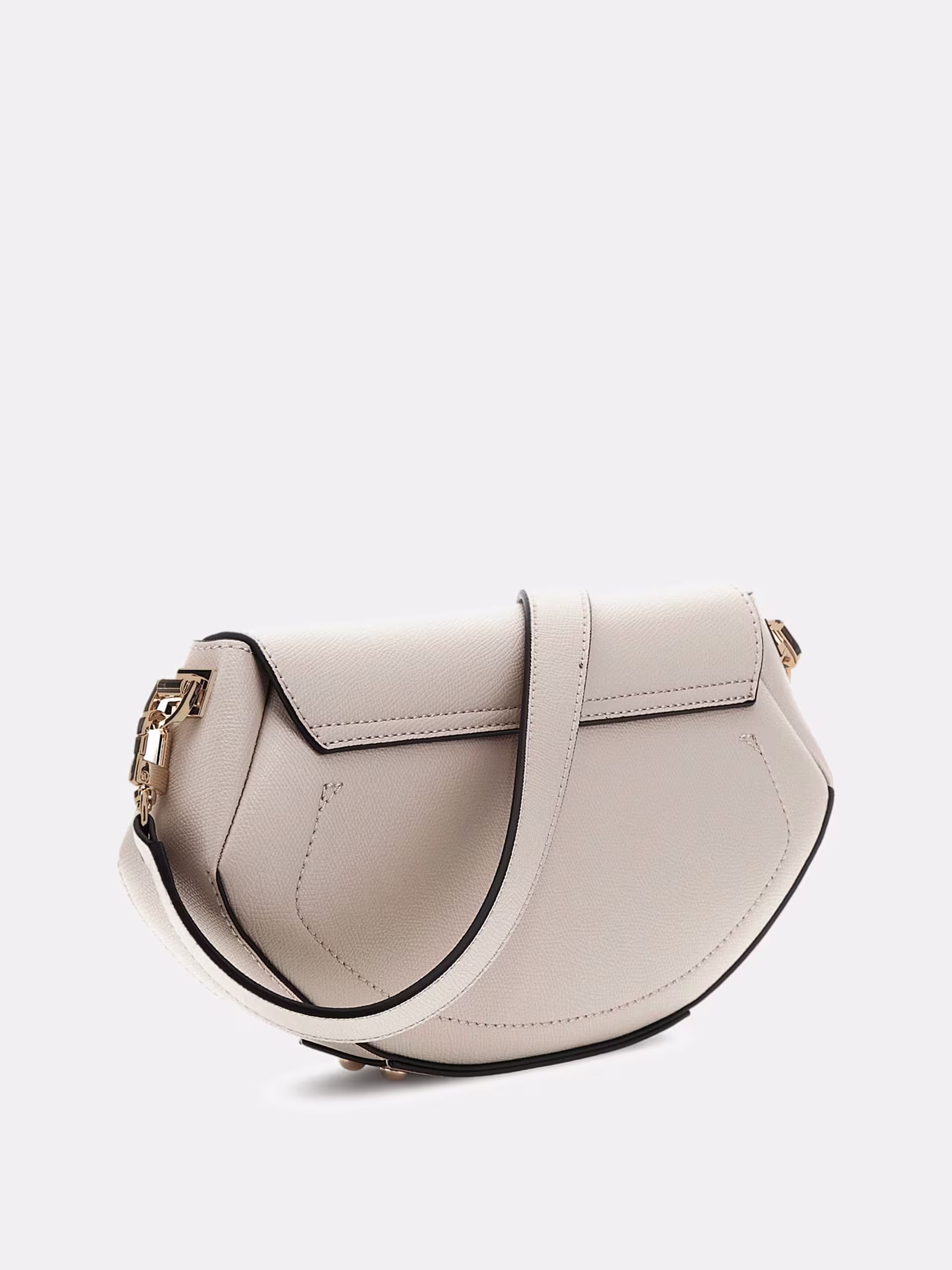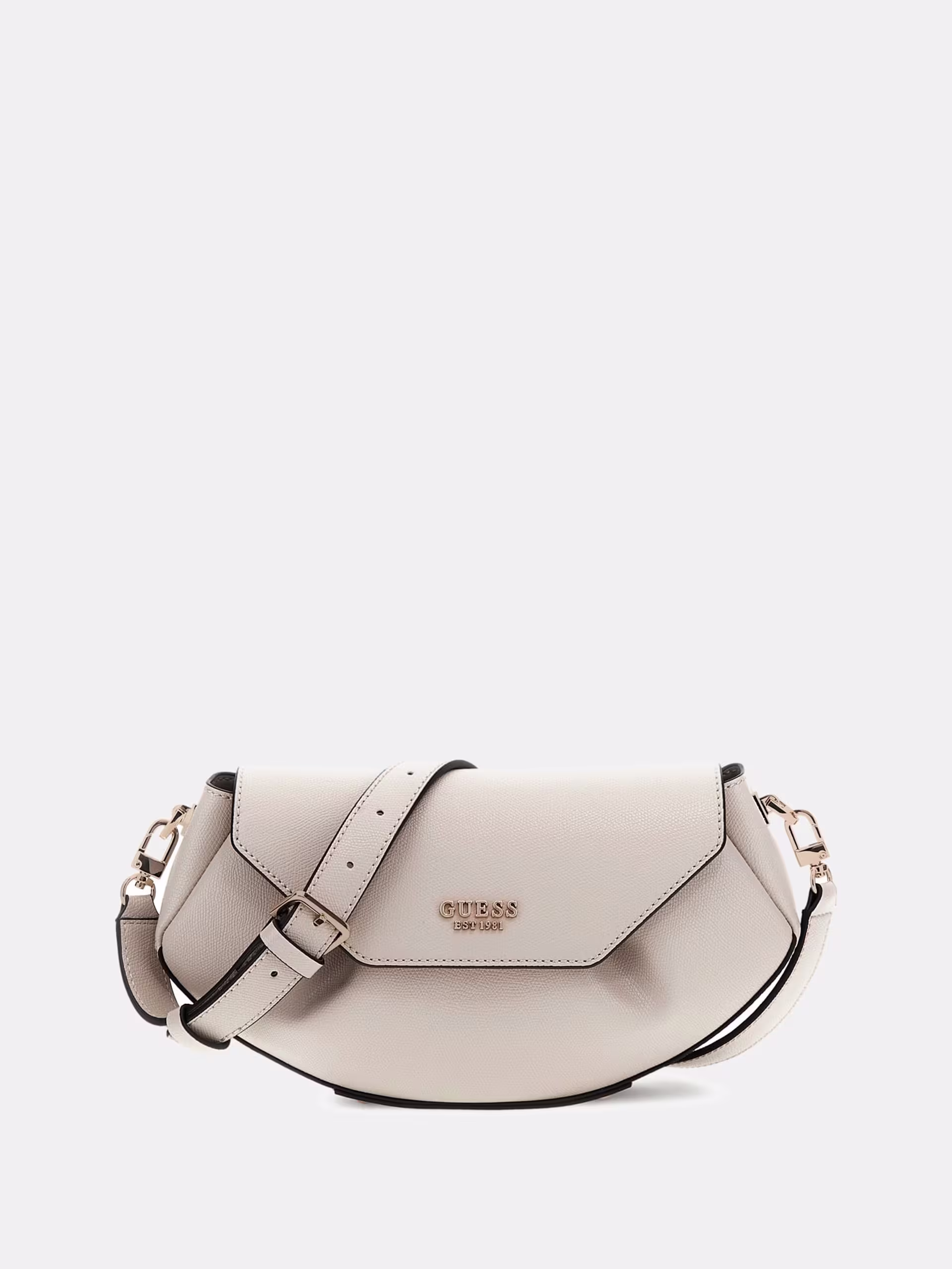 Esterno in simil pelle. Chiusura con patta e bottone. Metalleria color oro pallido. Scritta logo in metallo frontale. Dimensioni 30 x 16 x 5 cm