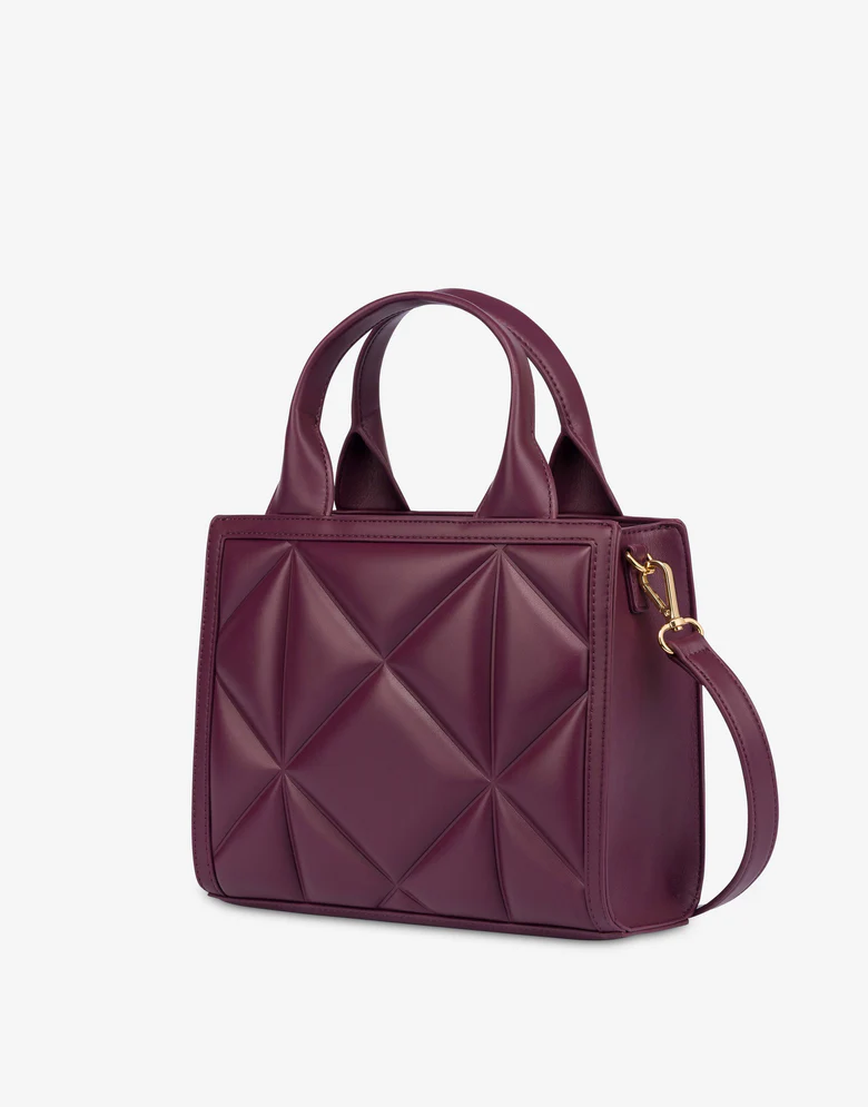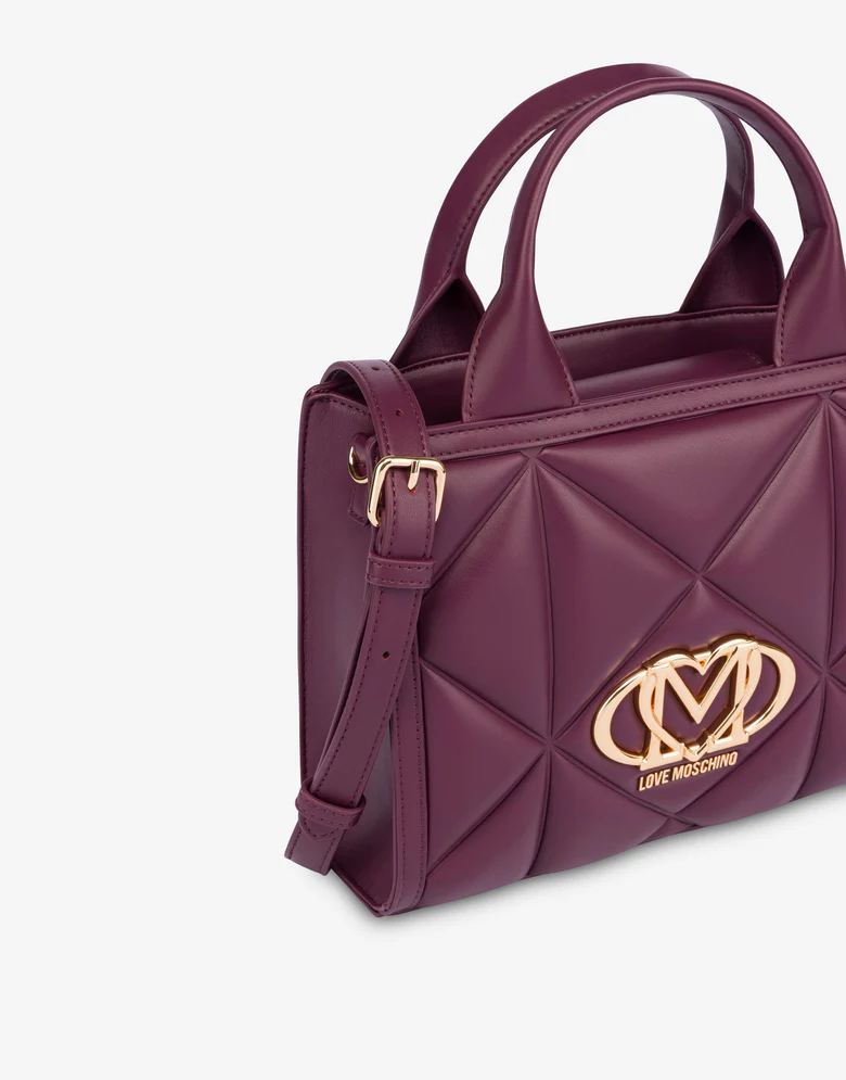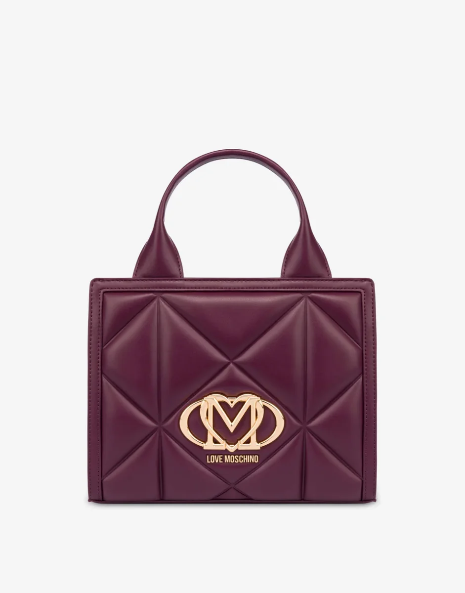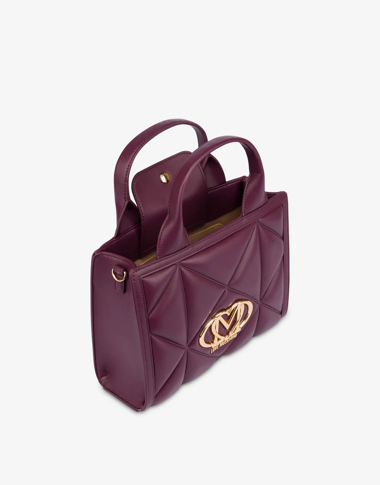 Logo LM con cuore e logo Lettering in galvanica oro Doppio manico Tracolla regolabile e removibile per molteplice portabilità Chiusura con magnete Foderata Tasca interna Dimensioni 36 x 20 x 9 cm