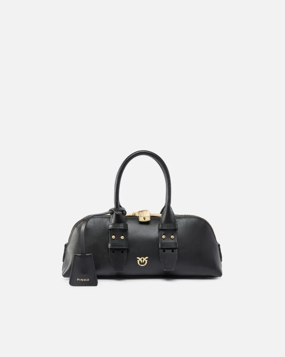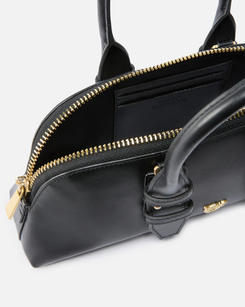 Borsa bowling Escape Bag dalle piccole dimensioni in morbida pelle, dotata di fodera in cotone e tasca a parete completa di portacarte. Caratterizzata dalla tracolla regolabile e rimovibile in pelle e dal manico per la portata a mano o a spalla, la borsa risulta estremamente versatile e pratica.