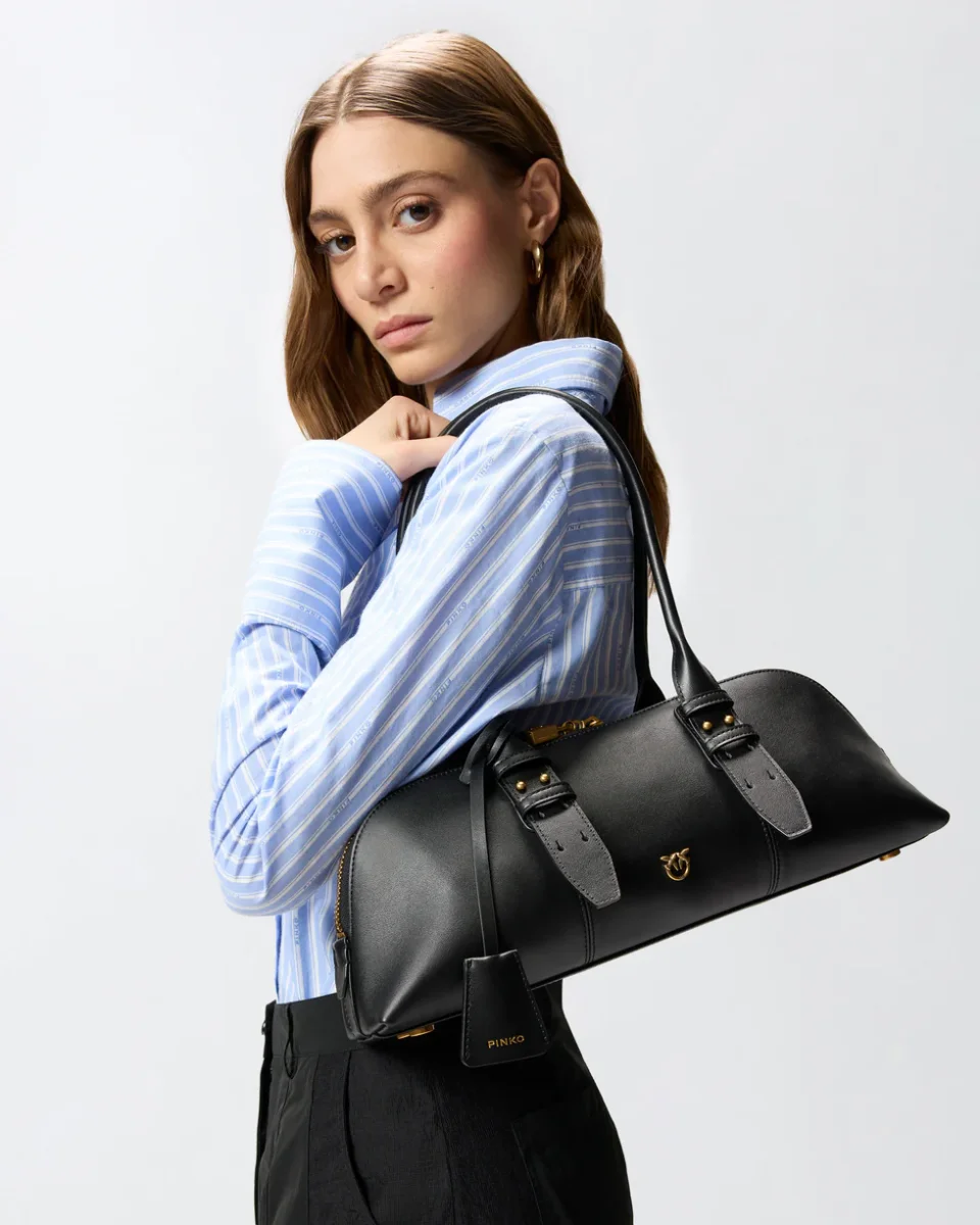 Borsa bowling Escape Bag Horizontal grande realizzata in morbida pelle. Estremamente versatile e raffinata, la borsa è dotata di due lunghi manici superiori e di una tracolla regolabile e rimovibile in pelle che offrono tre diverse opzioni di portabilità : a spalla, crossbody oppure a mano.