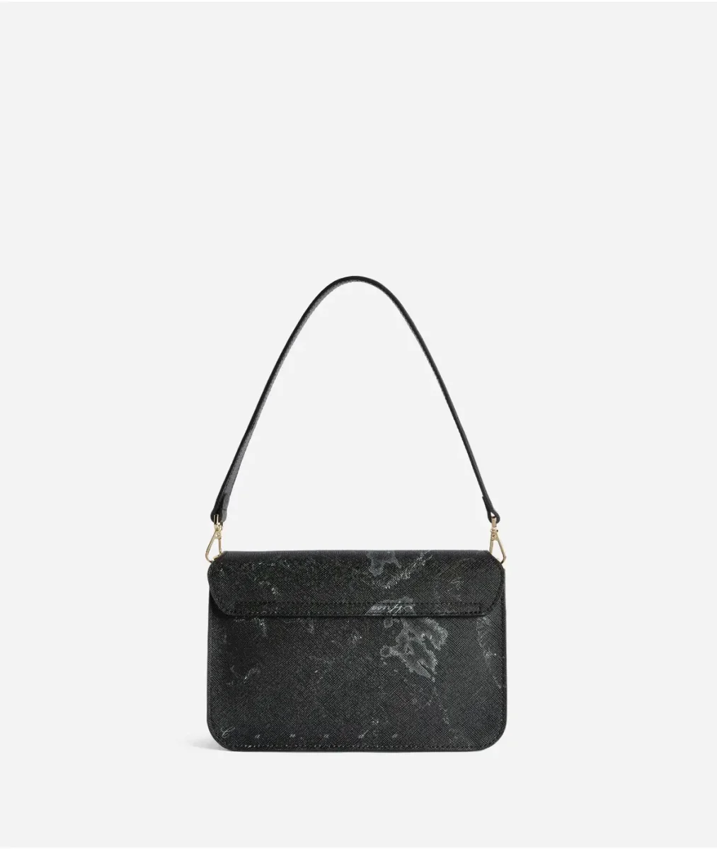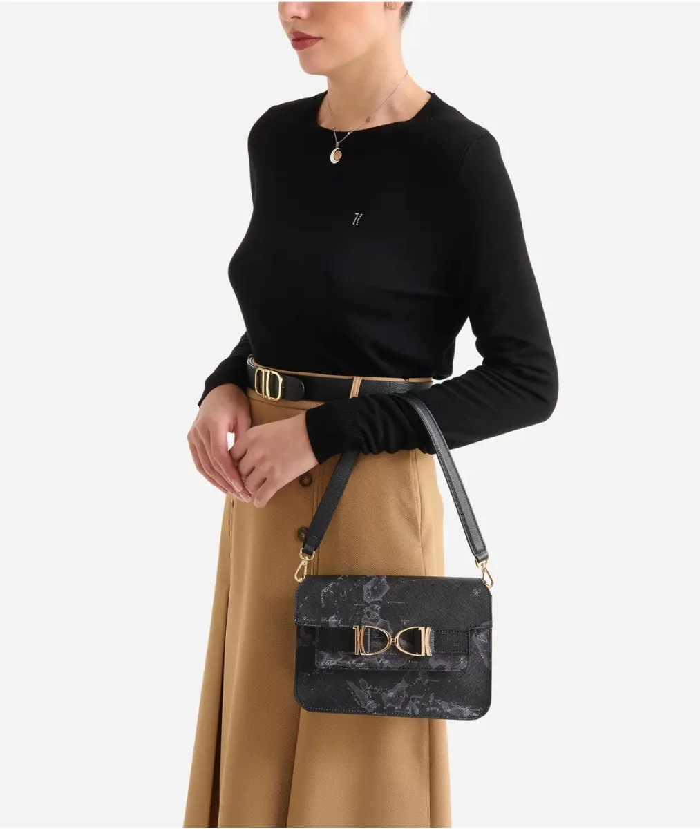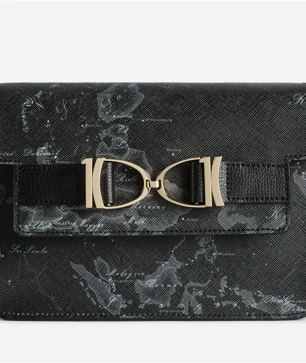 Linee contemporanee e animo grintoso sono i tratti distintivi della tracolla Chevalier Bag in tessuto Geo Night, abbinato a dettagli in pelle granata nera. Il nuovo maxi morsetto con doppio logo 1C richiama i motivi equestri della Collezione Destiny Land e offre contrasto al look total black, per un effetto ricco e d’impatto.