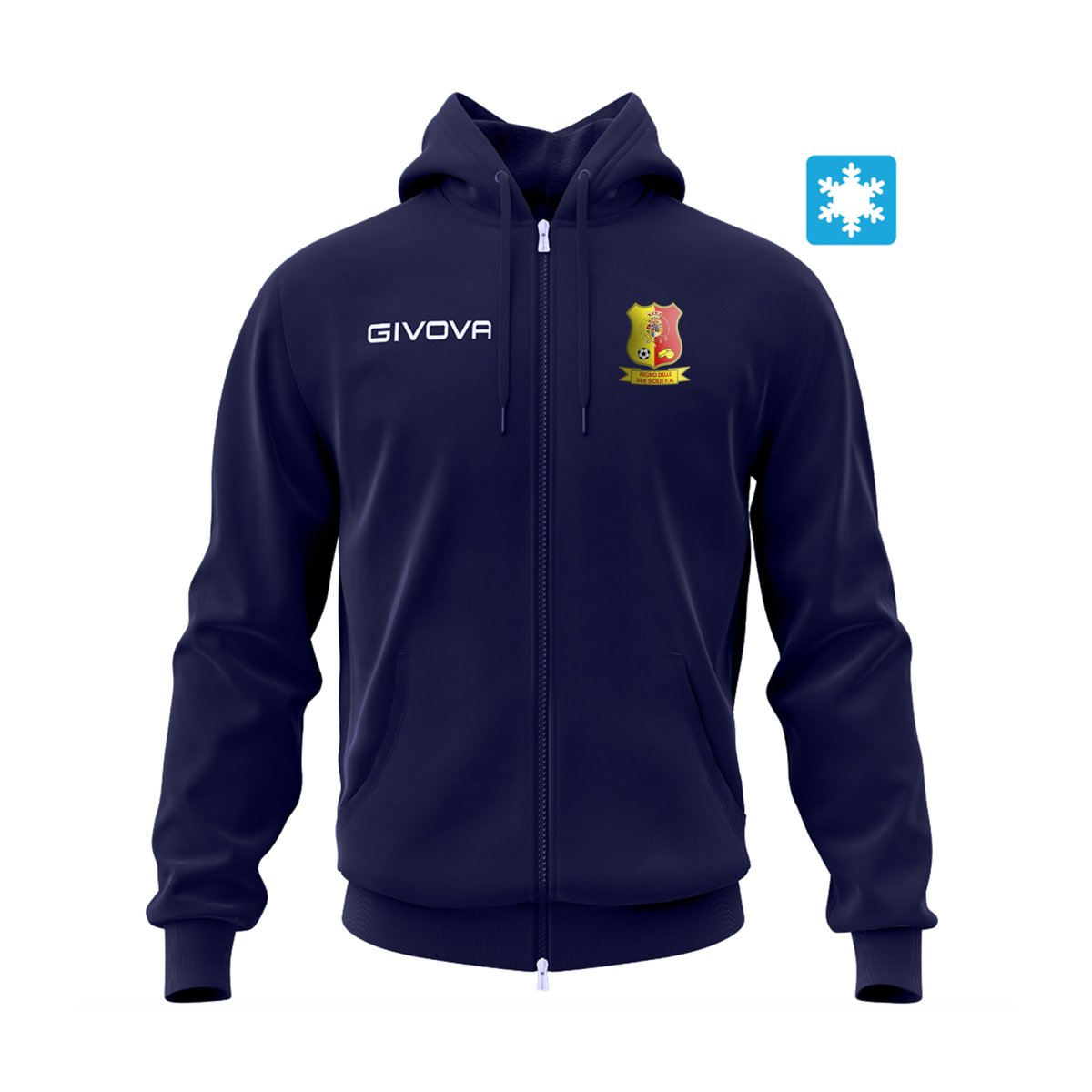 Tuta in Felpa 85% Poliestere – 15% Cotone Giacca con Cappuccio: Zip Intera; Logo Givova ricamato; Tasche laterali; Polsini in costina; Fondo Giacca in costina; Logo/patch del Team in transfer Pantaloni: Loghi ricamati; Tasche laterali; Fondo pantalone in costina; Logo/patch del Team in transfer Tessuto in felpa garzata adatto ai climi piรน freddi.