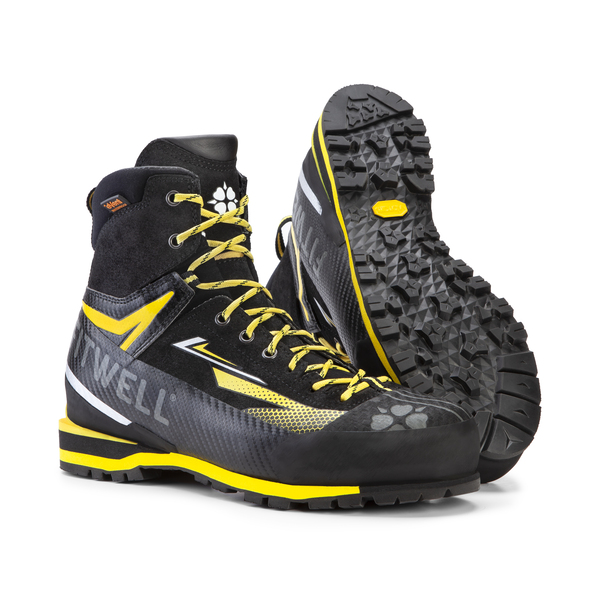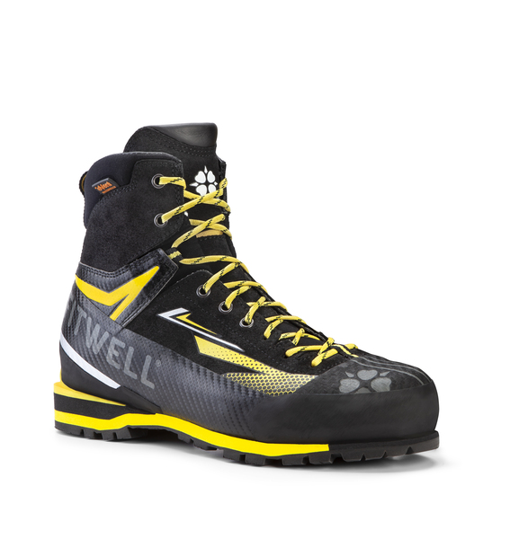 Modello leggero e performante. Tomaia in pelle scamosciata con rinforzi e bordo di contenimento ad effetto carbonio. Sottopiede in nylon caricato in fibra di vetro, leggero e antitorsione. Intersuola in microporosa a densitaฬ differenziata per un adeguato ammortizzamento, battistrada Vibramยฎ Pepe dallโeccellente grip. Spoiler posteriore per lโattacco di ramponi semi- automatici.