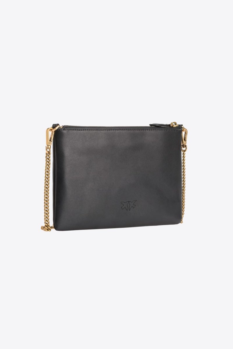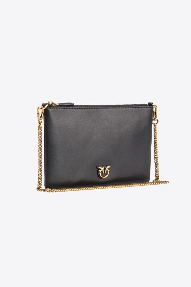 Borsa a tracolla flat in morbida pelle mano seta. Personalizzazione con placchetta Love Birds Diamond Cut. Interno foderato in polycotton e tracolla rimovibile a catena sottile. Chiusura con zip.
