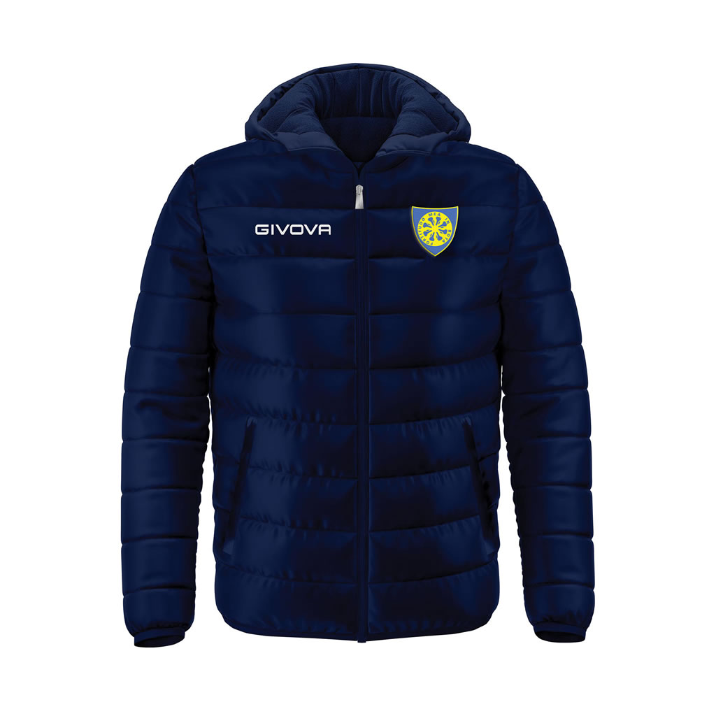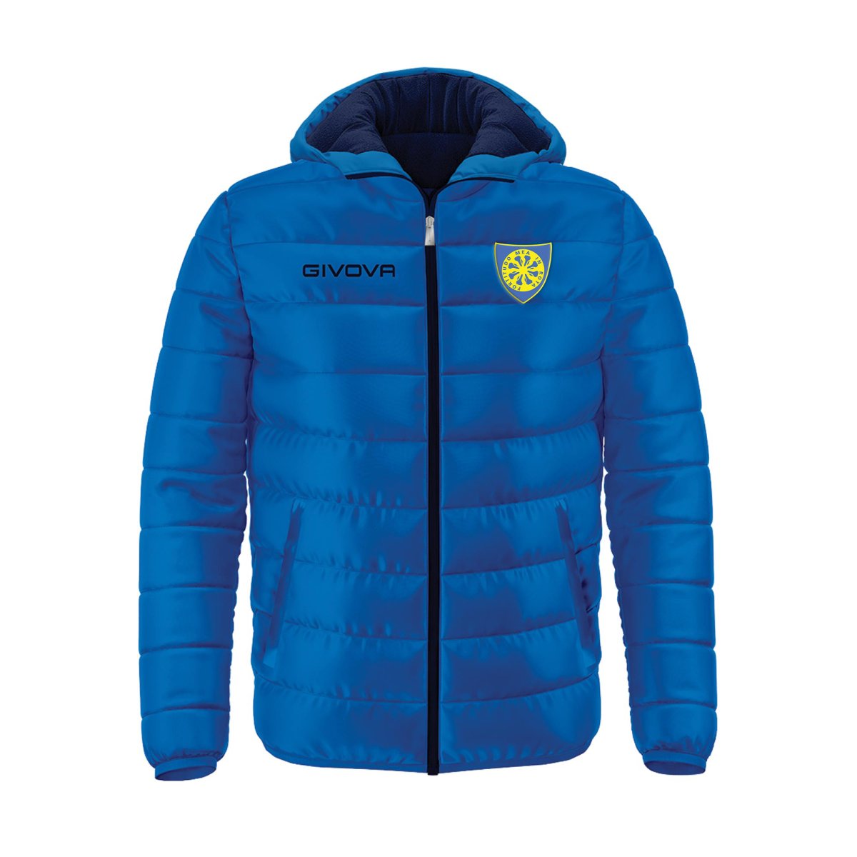 Caratteristiche: Esterno: 100% Poliestere 300T – 60-65gsm; Fodera: 100% Poliestere; Imbottitura: 100% Poliestere; Logo Ricamato Givova al petto; Logo PVC Givova al braccio; Logo/patch del Team in Transfer