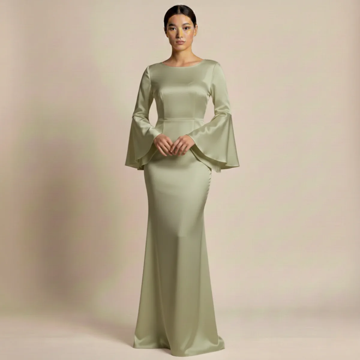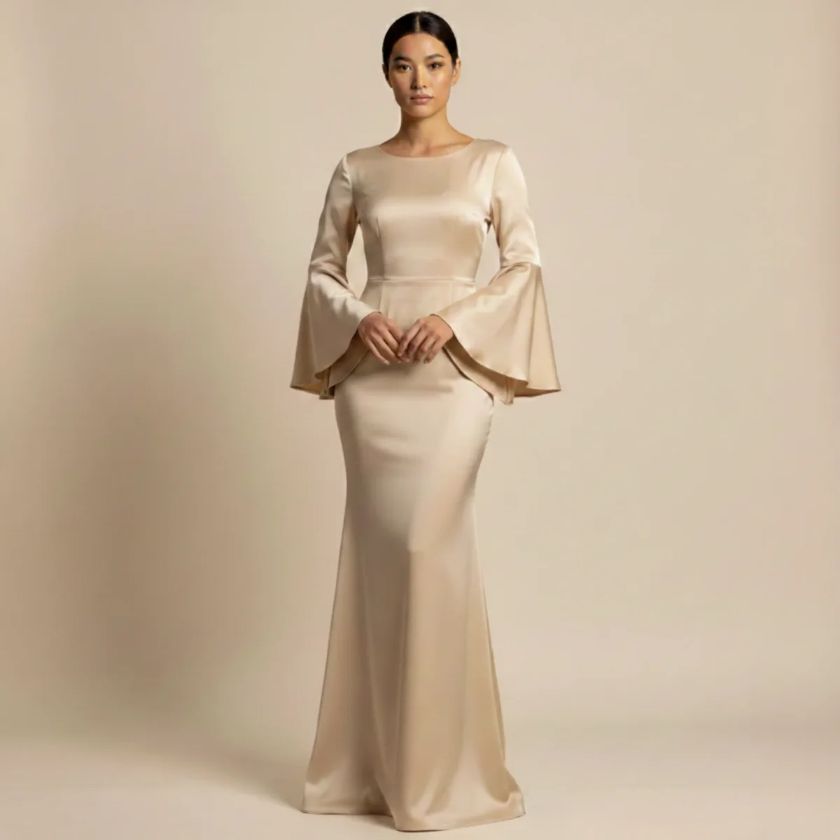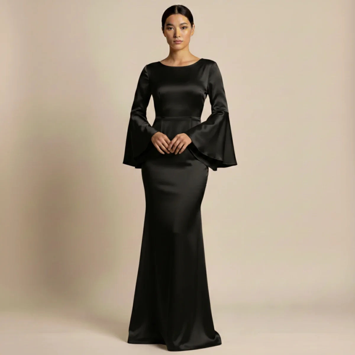 Lโabito lungo Gloria rappresenta grazia raffinata e Progettazione moderno. Il morbido drappeggio del pregiato tessuto in satin dona una silhouette fluida che emana eleganza a ogni passo. Le maniche ampie e scenografiche aggiungono un tocco di stile deciso, mentre la drappeggiatura sofisticata valorizza armoniosamente la figura. Questo abito รจ perfetto per momenti festivi, serate eleganti e occasioni speciali di grande stile.