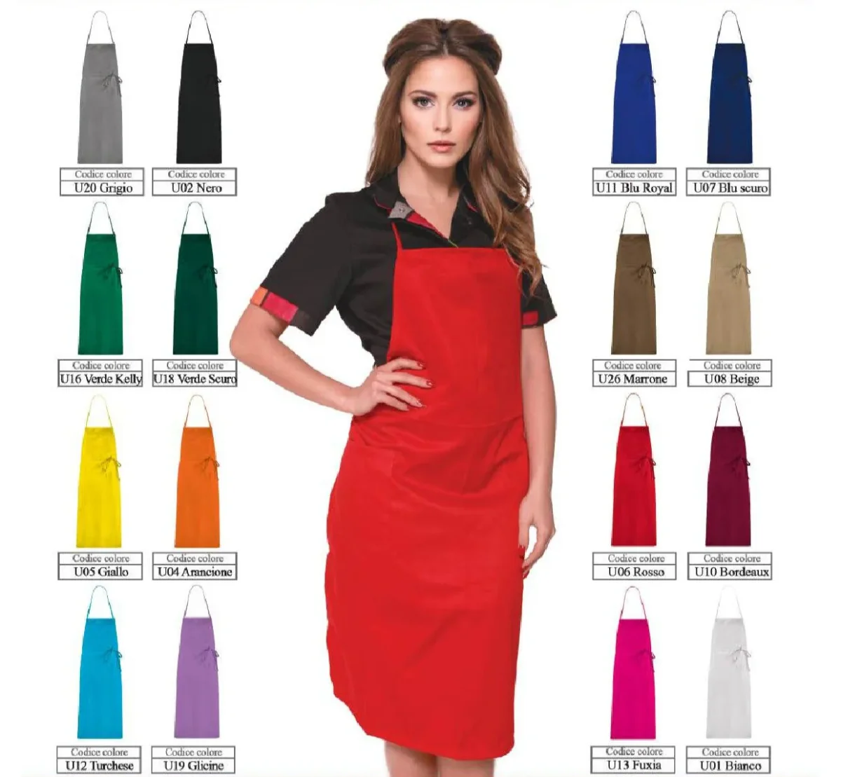 Grembiule con pettorina dal design classico. Lungo fino al ginocchio offre una copertura completa per proteggere gli indumenti durante le fasi di lavoro. Dotato di una tasca sul lato per poter riporre gli utensili o altri oggetti. Realizzato in tessuto ( 35% Cotone 65% Poliestere )