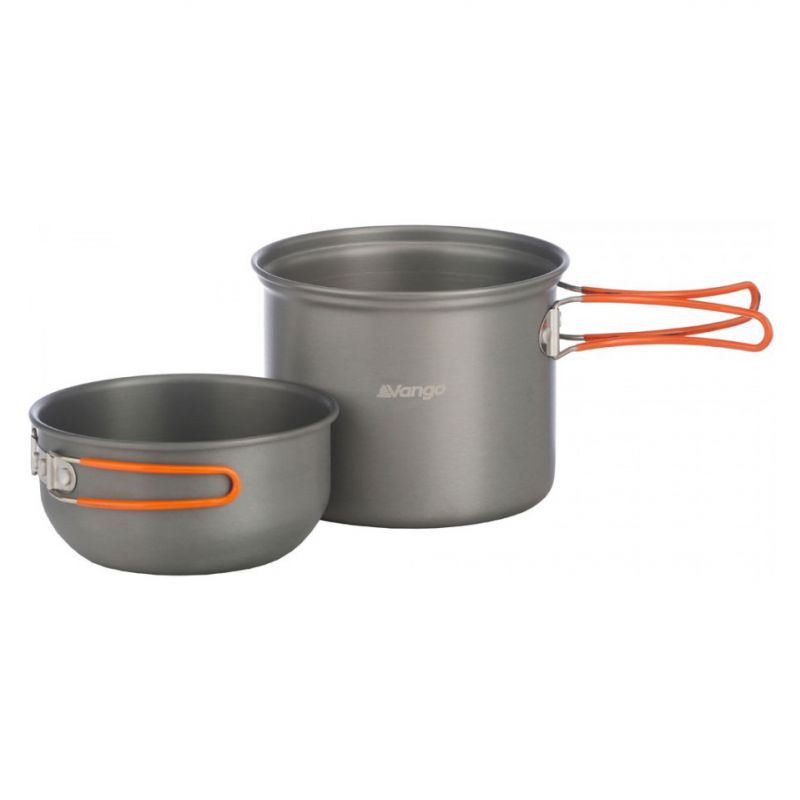 Questo set da cucina in Hard Anodised è perfetto per i viaggiatori solitari che vogliono fermarsi per un pasto veloce. Pulizia facile, peso ridotto, resistenza e durevolezza. Le due pentole da cui è composto il set (piccola: ø 12×6 cm / grande: ø 12.5×10.2 cm) sono dotate di maniglie pieghevoli resistenti al calore.