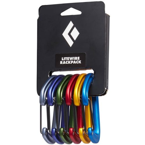 Il LiteWire Rackpack della Black Diamond è un set di 6 moschettoni da arrampicata con leva a filo.