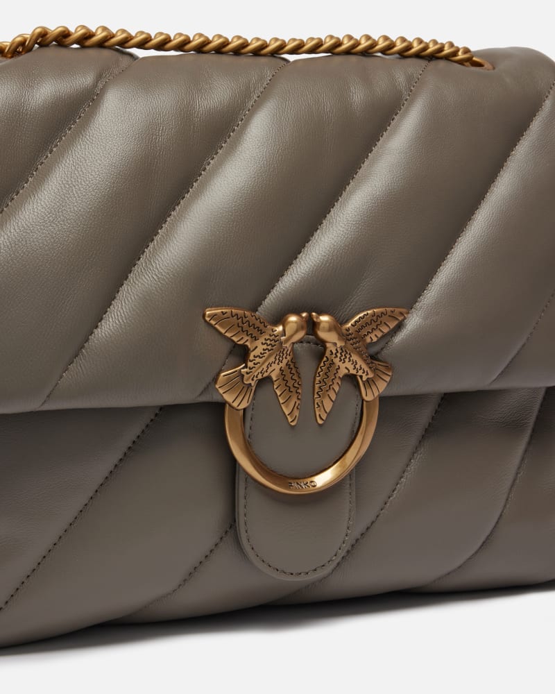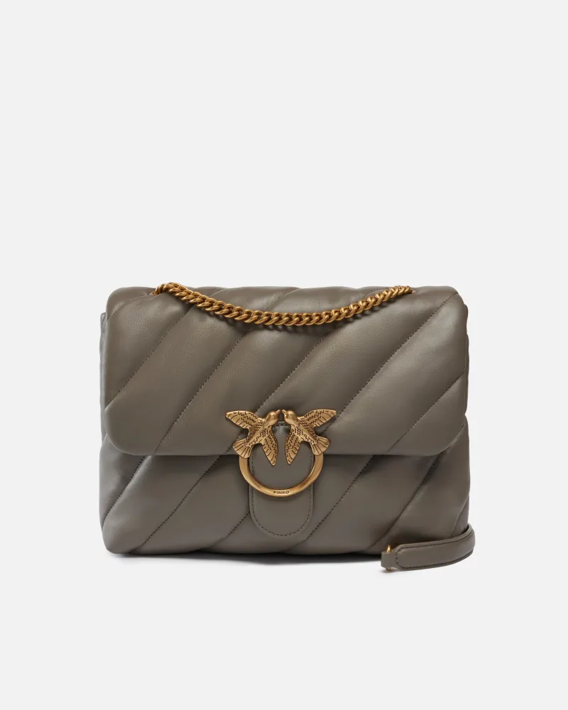 Big Love Bag Puff in morbida nappa con maxi trapuntatura obliqua. La chiusura è completata dall’iconica fibbia in metallo Love Birds Diamond Cut. L’interno è foderato in microfibra scamosciata e comprende tramezza chiusa con zip e tasca a parete. La tracolla combina la classica catena metallica rotonda al pratico spallaccio in nappa.