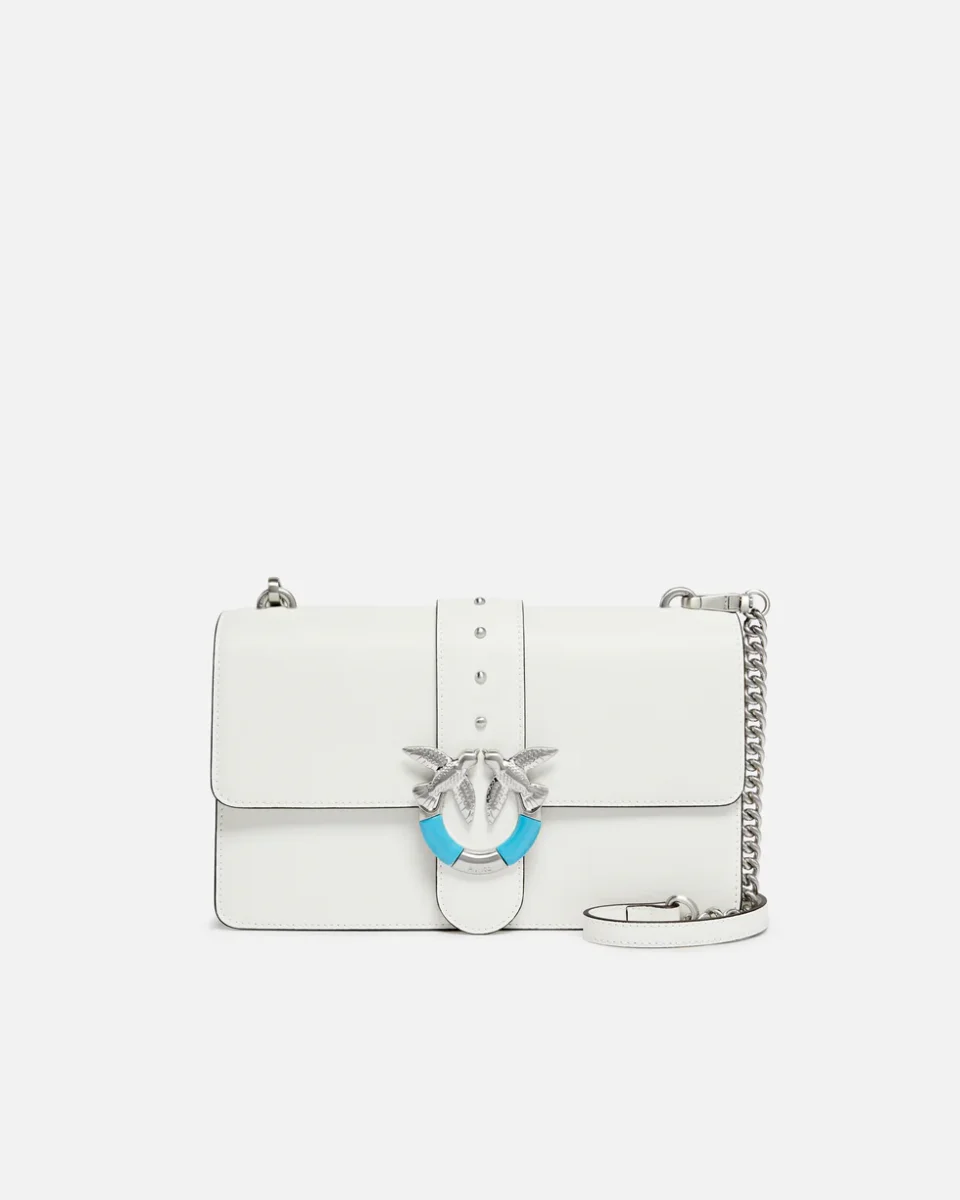 Borsa Love Bag One di medie dimensioni in morbida pelle mano seta. Il modello presenta una chiusura a baccello con bottone magnetico impreziosita da piccole borchie e dall’emblematica fibbia Love Birds Diamond Cut con inserti in pietra turchese che aggiungono una nota di colore, mentre l’interno foderato in tessuto drill di cotone è dotato di due scomparti con tramezza centrale chiusa da zip.