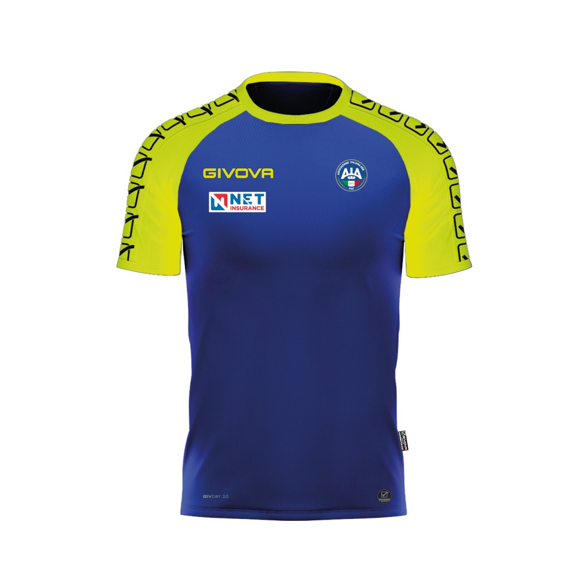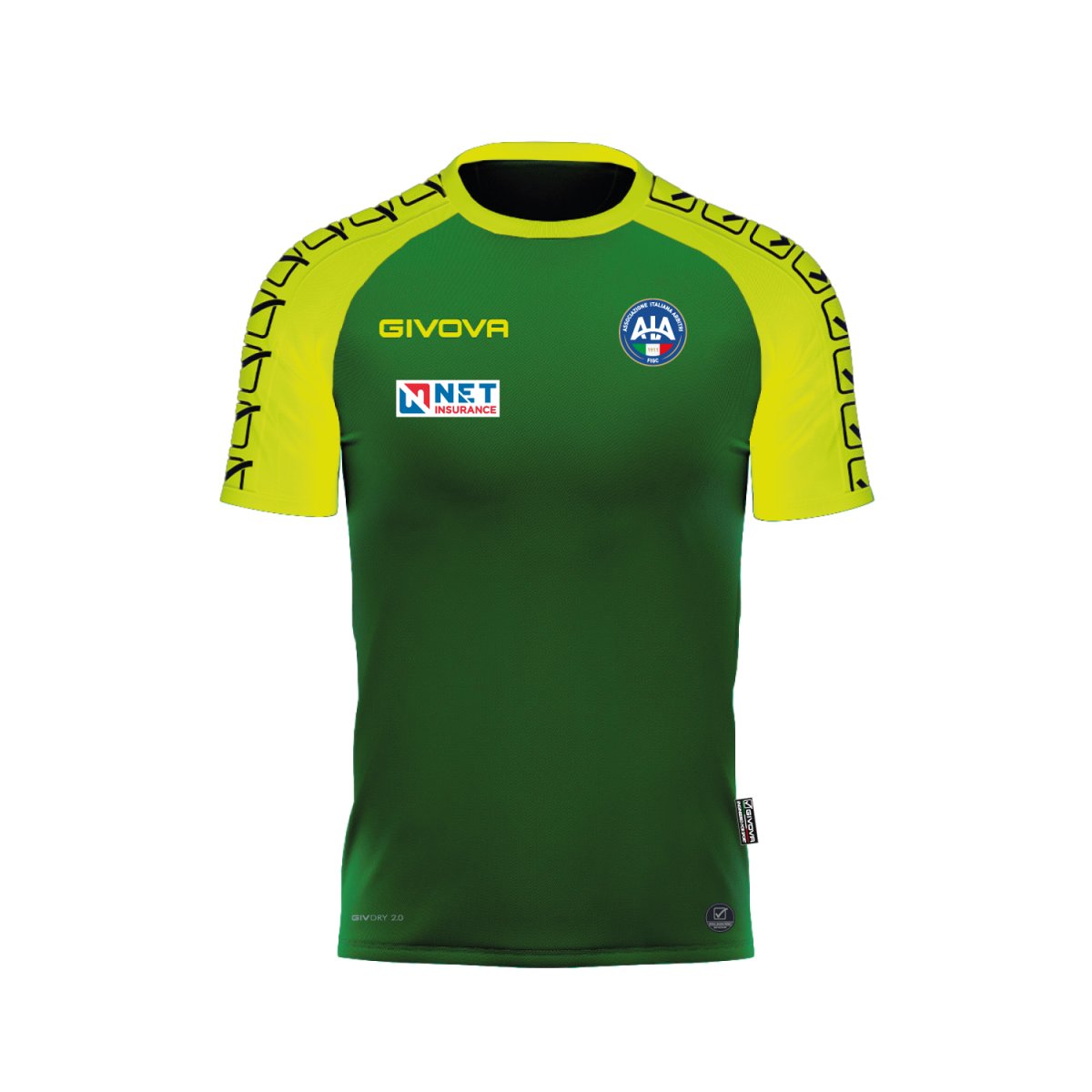 Caratteristiche: 100% Poliestere Interlock 140 gsm; Logo ricamato Givova; Logo AIA Woven badge con bordatura ricamata; Full sublimation; Bande Laterali con logo GIVOVA sublimato. La Maglia Allenamento MC Gold รจ realizzata al 100% in poliestere interlock leggero con un peso di 140 gsm, garantendo una sensazione di leggerezza e comfort durante l’allenamento. Il logo posizionato con cura conferisce un tocco di eleganza e qualitร . La tecnica di full sublimation consente una stampa di alta qualitร su tutta la superficie della maglia, garantendo colori vibranti e duraturi. Le bande laterali con il logo GIVOVA sublimato aggiungono uno stile distintivo e dinamico…