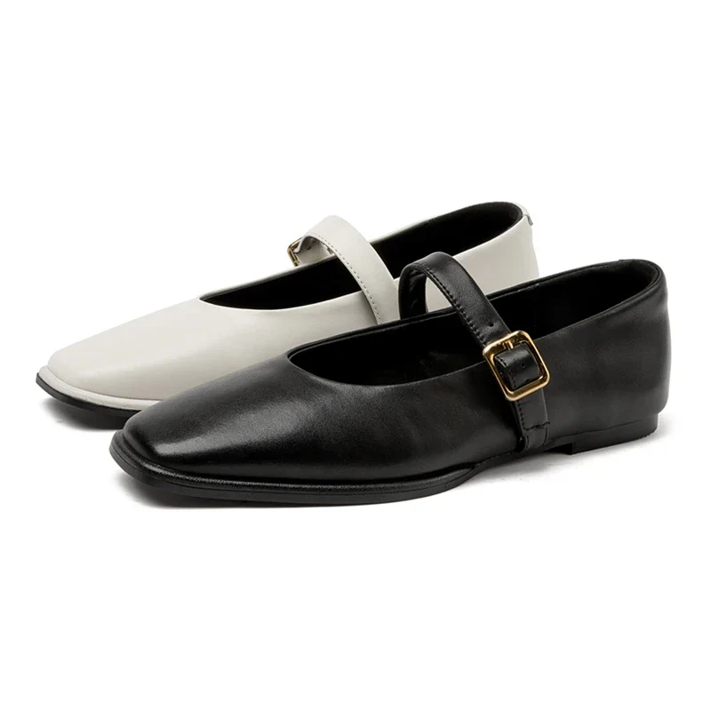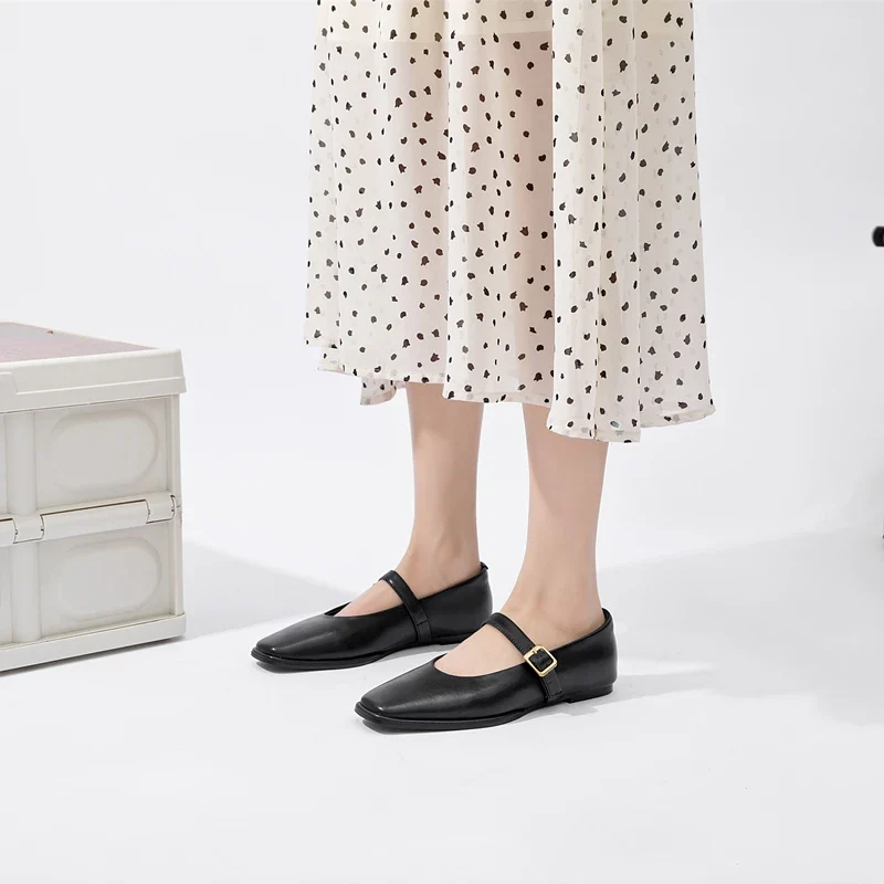 Queste scarpe Mary Jane presentano una silhouette classica con una punta quadrata, realizzate in morbida pelle bovina. Il design piatto offre comfort e versatilitร , rendendole ideali per ogni occasione. La chiusura con cinturino assicura una calzata sicura, mentre il materiale di alta qualitร  garantisce durata e stile. Perfette per un look casual e raffinato.