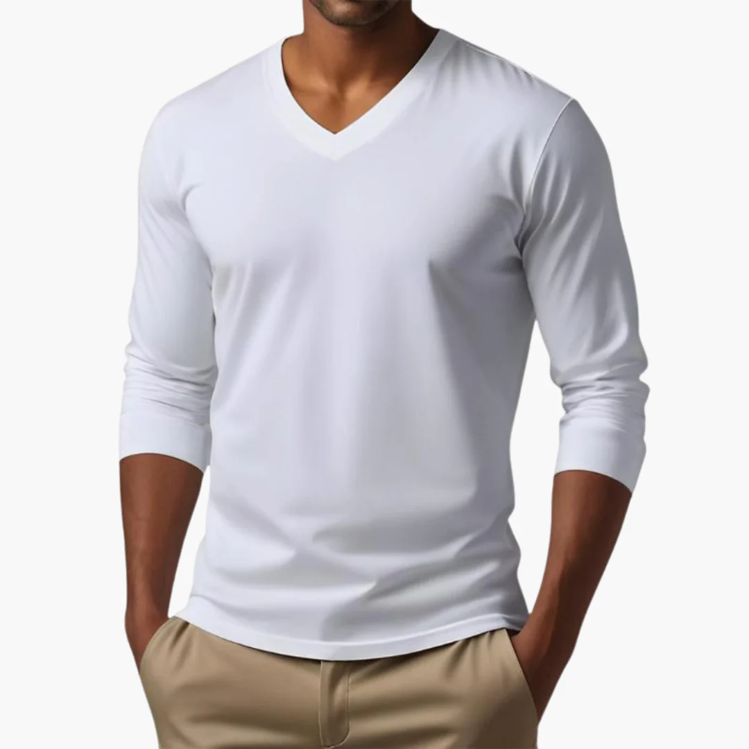 Questa maglia a maniche lunghe con scollo a V รจ un capo versatile che si adatta perfettamente a ogni occasione. Realizzata in tessuto elasticizzato, offre una vestibilitร aderente che garantisce libertร di movimento e una sensazione piacevole sulla pelle. Ideale per la stagione autunnale e invernale, si presta a look casual e piรน eleganti.