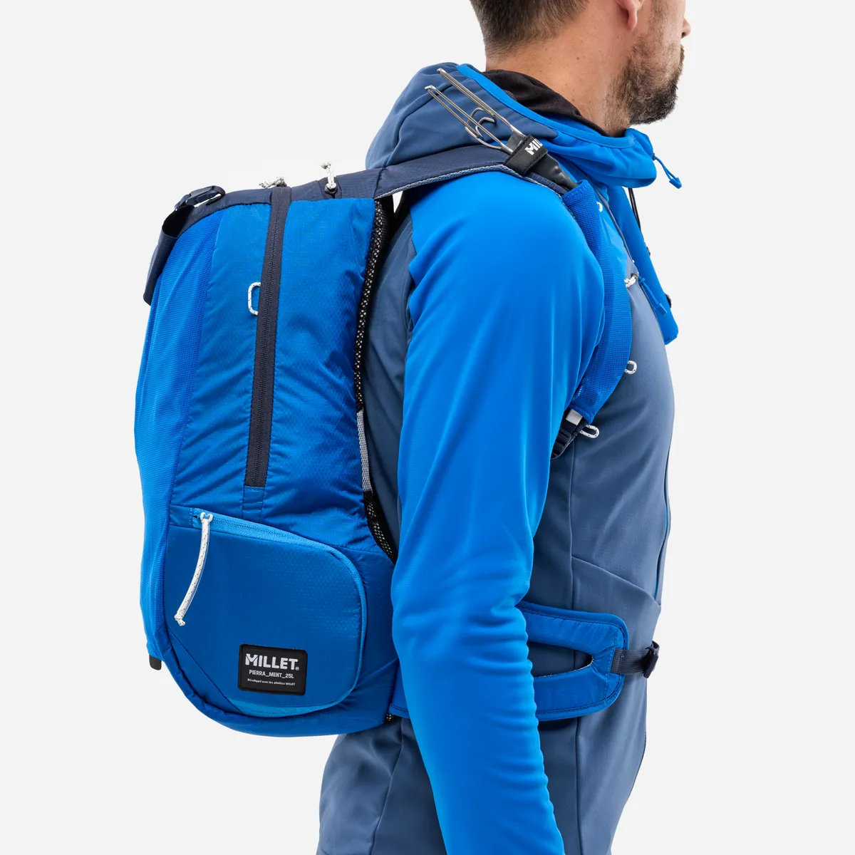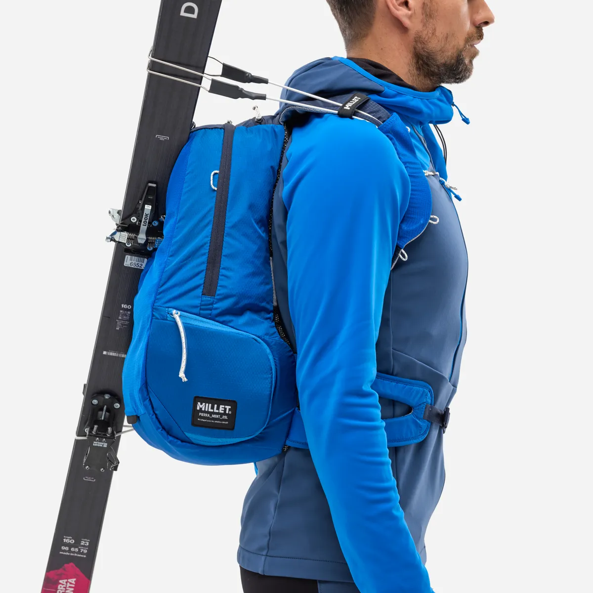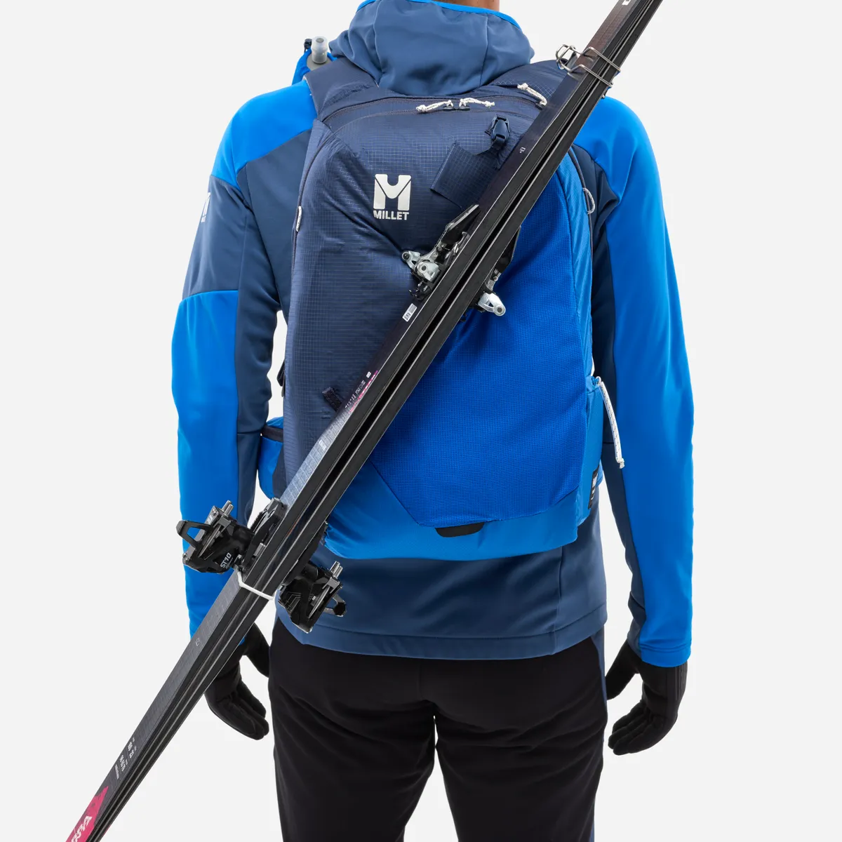 Le sessioni di allenamento quotidiane si susseguono. Il nostro zaino da scialpinismo PIERRA MENT 25 si adatta perfettamente alla schiena. Leggero e resistente grazie alle fibre in Dyneema®, contiene tutto il necessario per la giornata. La pala e la sonda sono riposte all’interno dello zaino. I ramponi sono nella tasca ad accesso diretto e la piccozza è sul dorso dello zaino. Apprezziamo il fatto di poter bere senza fermarci, grazie alla nostra sacca di idratazione e alla borraccia supplementare sullo spallaccio. In vetta, tiriamo fuori la giacca protettiva attraverso l’apertura con cerniera. Sganciamo gli sci dal portasci diagonale con ganci e infiliamo le nostre pelli nella tasca anteriore in rete. Partiamo nella neve fresca!