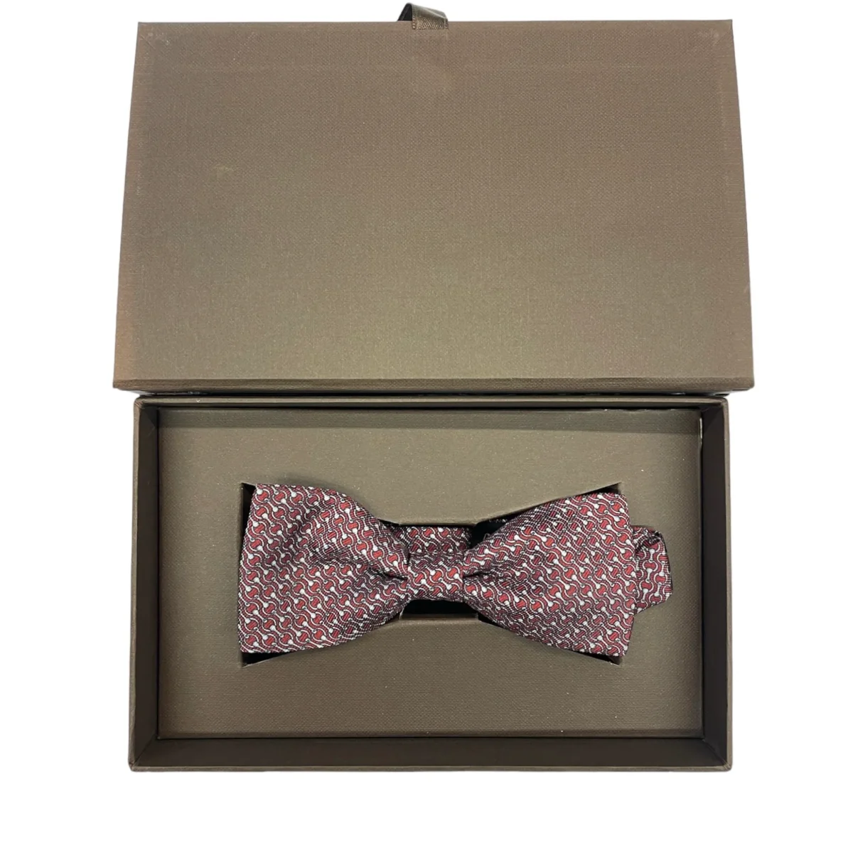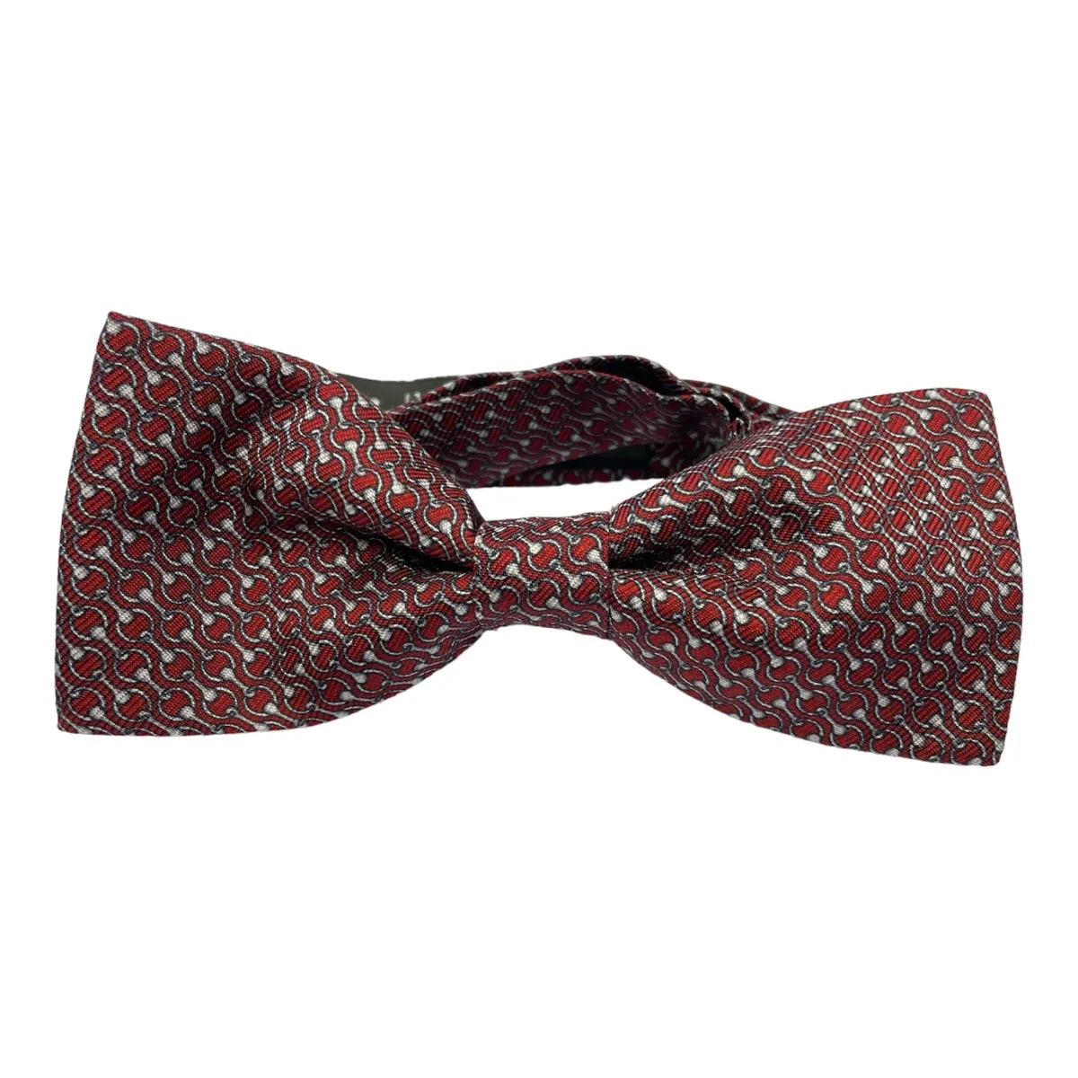 Elegante e contemporaneo Il modello è un papillon sartoriale annodato regolabile. Questo è realizzato interamente a mano in 100% Seta Twill Made in Italy. Il colore scelto è bordeaux con un elegante motivo briglie Libretto Garanzia. Confezione Elegante.