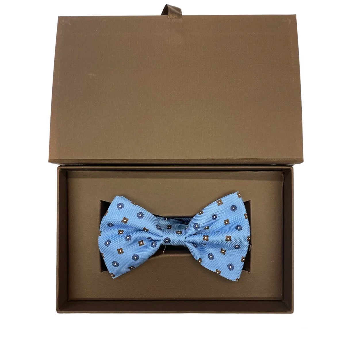 Papillon Sartoriale seta celeste margherite blu e fiori marroni