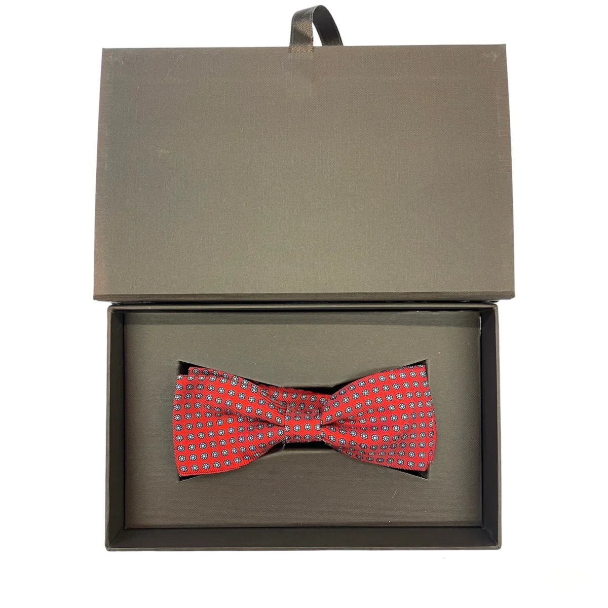 Rosso passione Il modello è un papillon sartoriale annodato regolabile. Questo è realizzato interamente a mano in 100% Seta Twill Made in Italy. Il colore scelto è un rosso con fiorellini. Libretto Garanzia. Confezione Elegante.