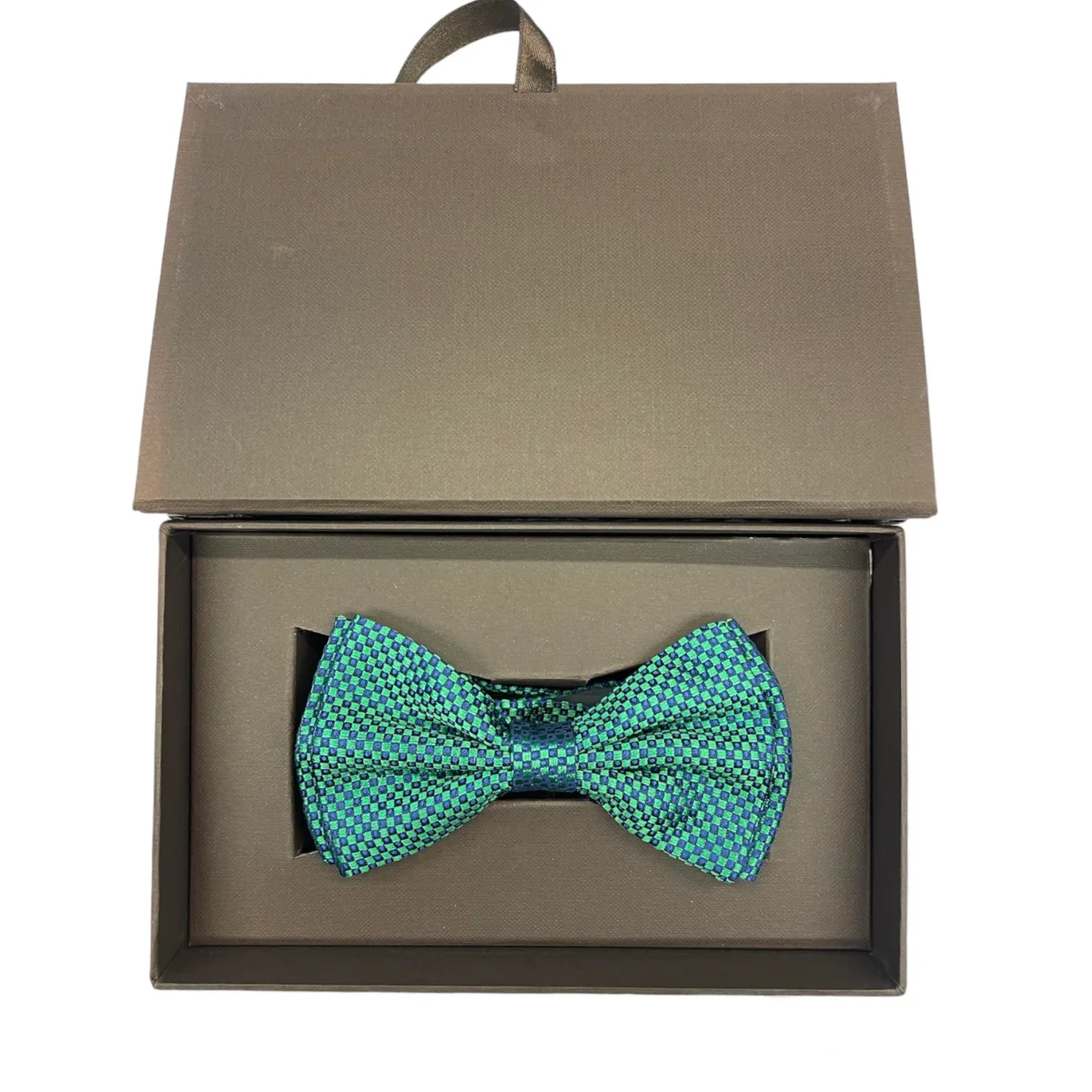 Un papillon a scacchi per veri gentlemen. Il papillon sartoriale è realizzato interamente a mano in 100% Seta Jacquard Made in Italy.Il modello è un annodato regolabile mentre la fantasia scelta è minimale ma estremamente sofisticata. Sul fondo verde infatti nasce una fantasia a scacchi in blu. Libretto Garanzia. Confezione Elegante.