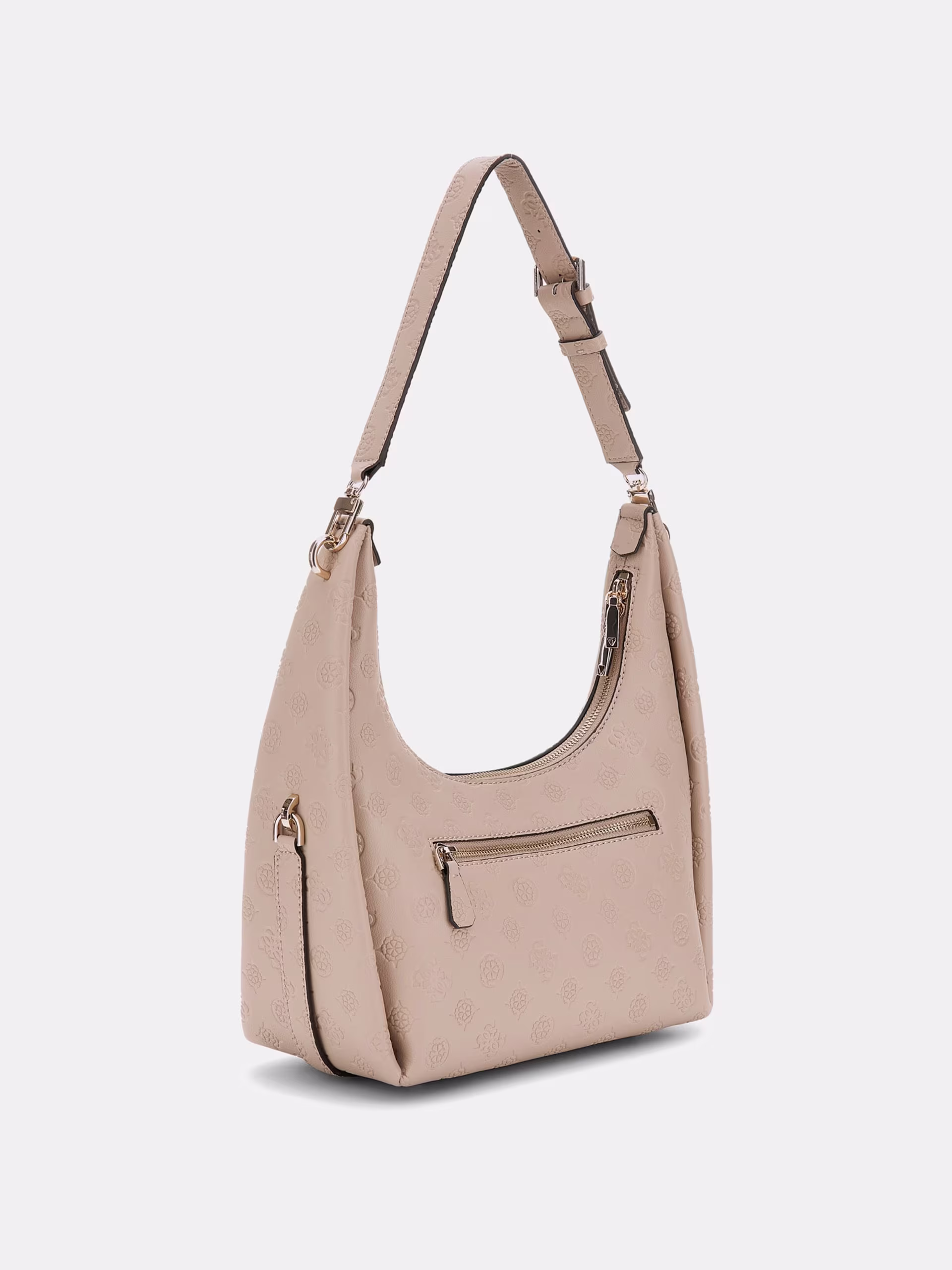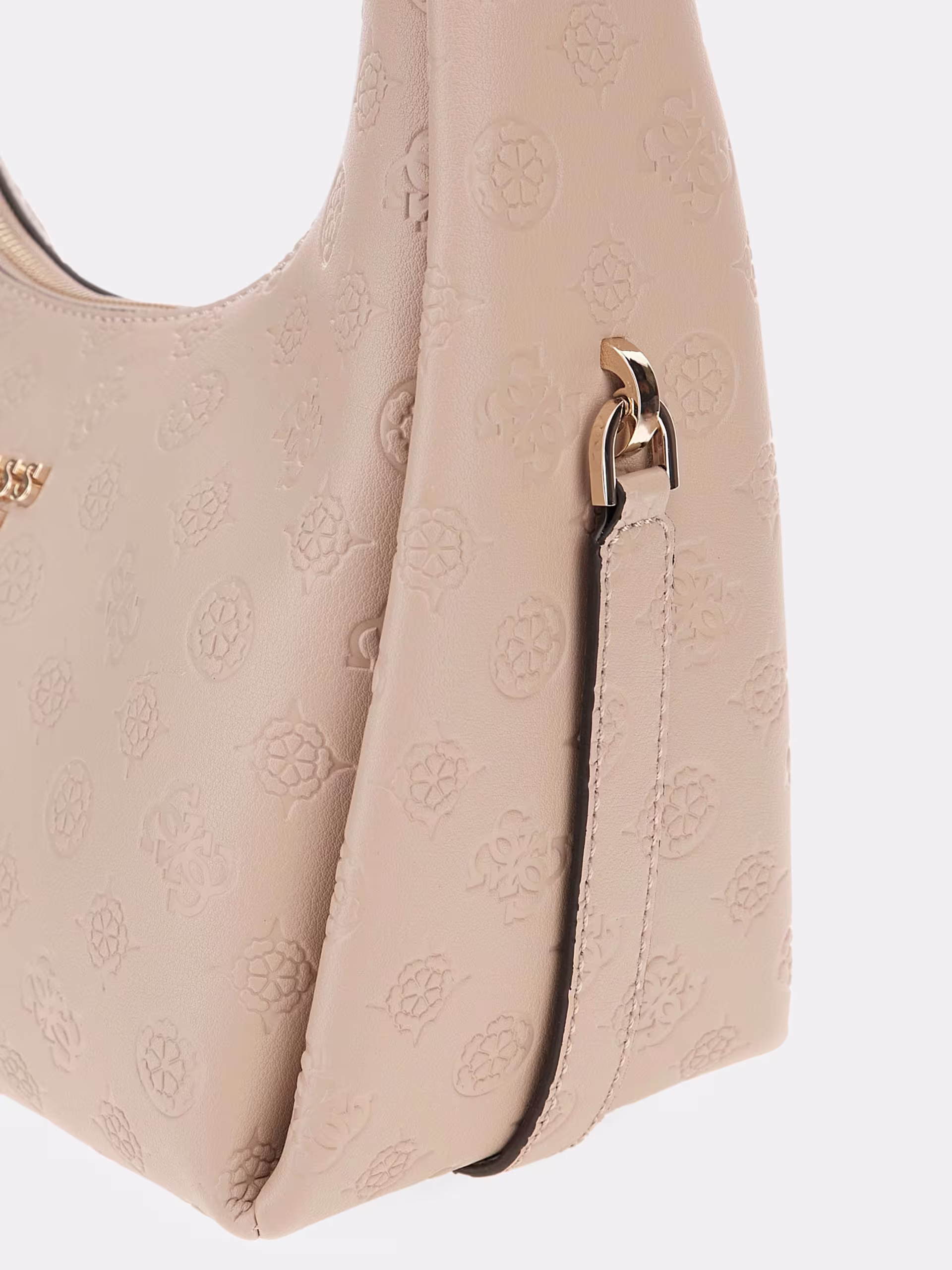 Esterno in simil pelle. Chiusura con cerniera lampo. Metalleria color oro pallido. 4G e logo peony impresso. Fodera personalizzata con logo. Tasca sul retro con cerniera lampo. Scritta logo in metallo frontale. Dimensioni 30 x 31 x 15 cm
