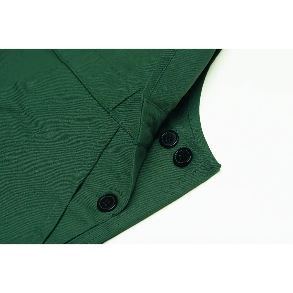 - Functional storage: Brass-zippered chest pocket, additional bib pocket, two reinforced front pockets, one back pocket, and ruler pocket
