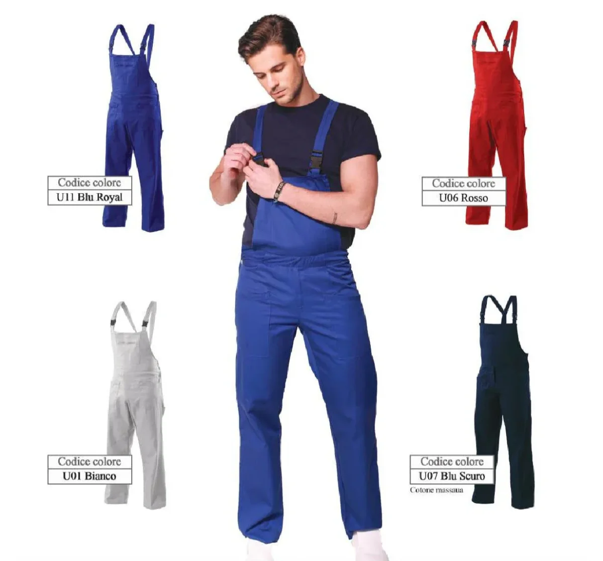 Tuta salopette da lavoro, modello con bretelle e pettorina garantisce una vestibilitร sicura e stabile. La tasca anteriore con zip รจ ideale per riporre oggetti di valore in modo sicuro, mentre le due tasche ai fianchi offrono ulteriore spazio per gli strumenti di lavoro. Realizzata in policotone o in cotone Massaua, questa tuta combina