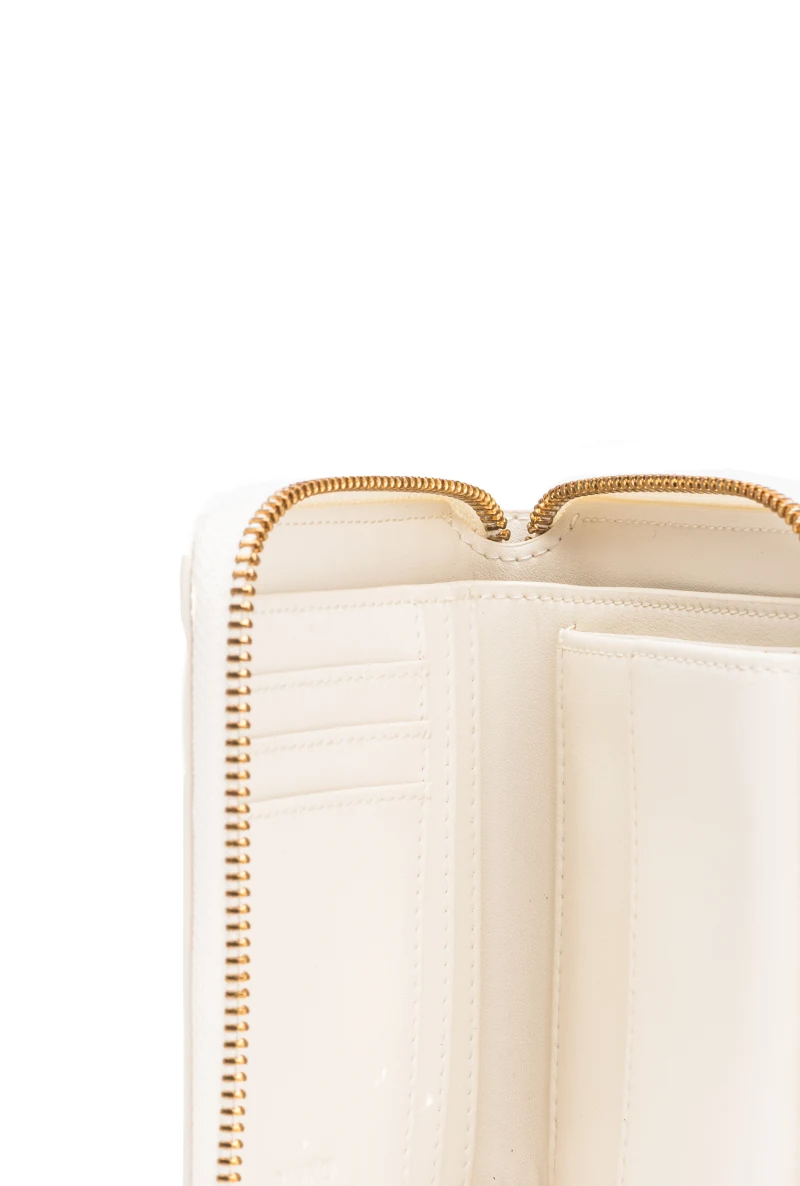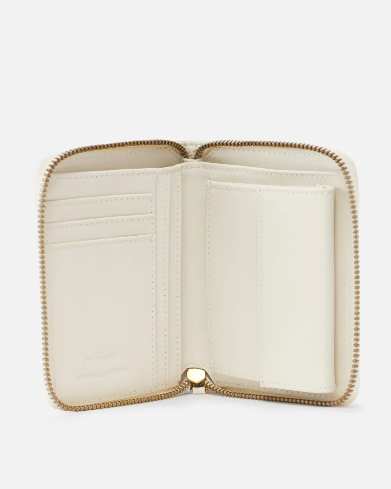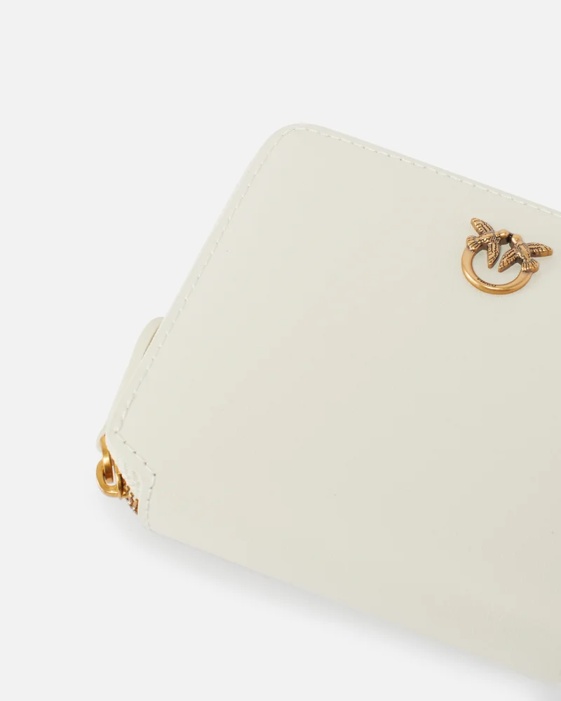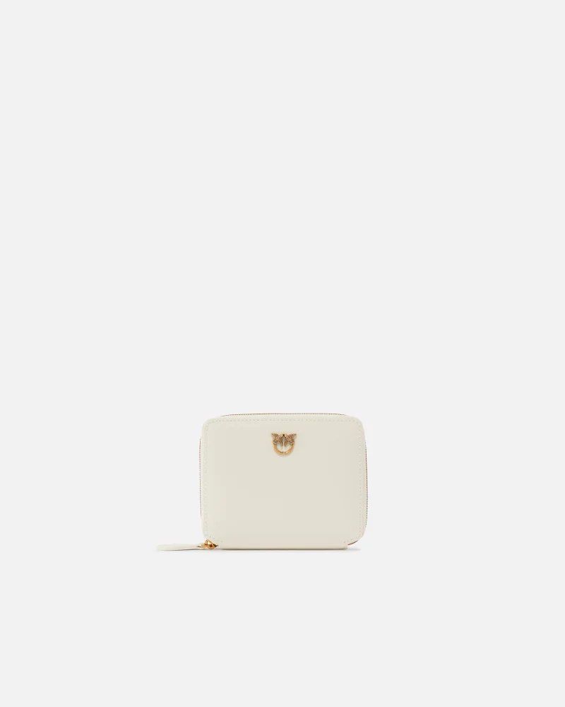 Portafoglio zip-around di forma quadrata in morbida pelle mano seta, personalizzato con placchetta Love Birds Diamond Cut su base in pelle. L’interno è foderato in polycotton. Chiusura con zip.
