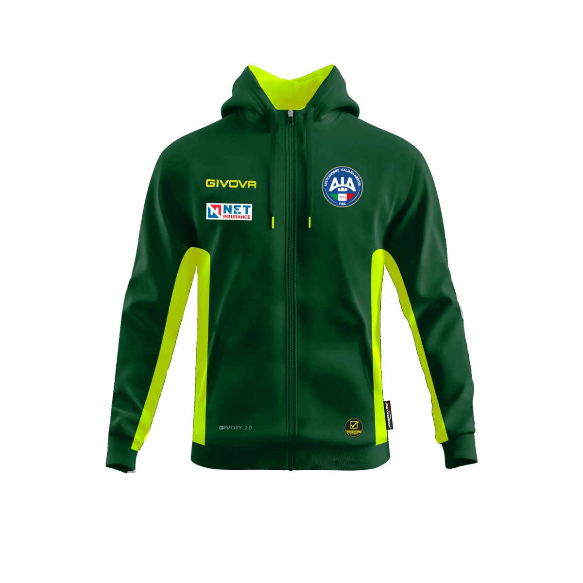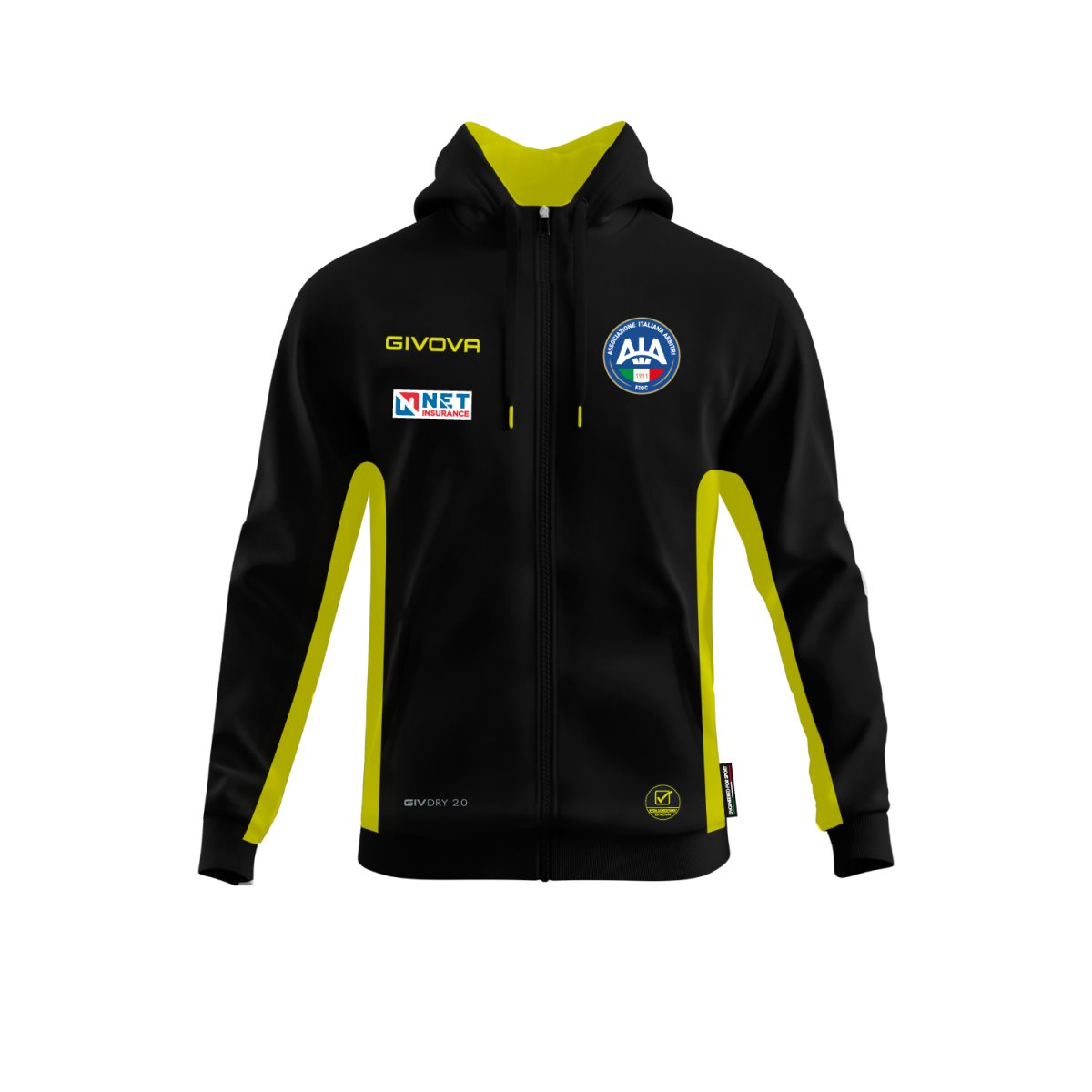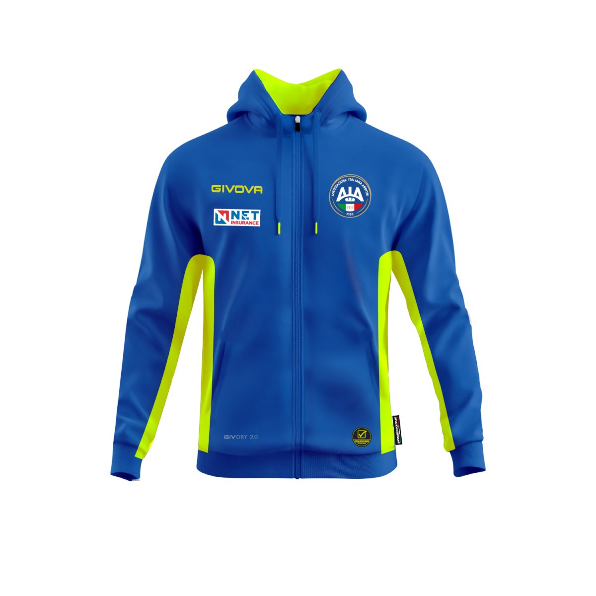 Caratteristiche: 100% Poliestere 202 gsm Interlock; Cappuccio, polsini e fondo giacca in costina; Logo Givova ricamato;ย Logo AIA Woven badge con bordatura ricamata; Tasche laterali con zip; zip intera.