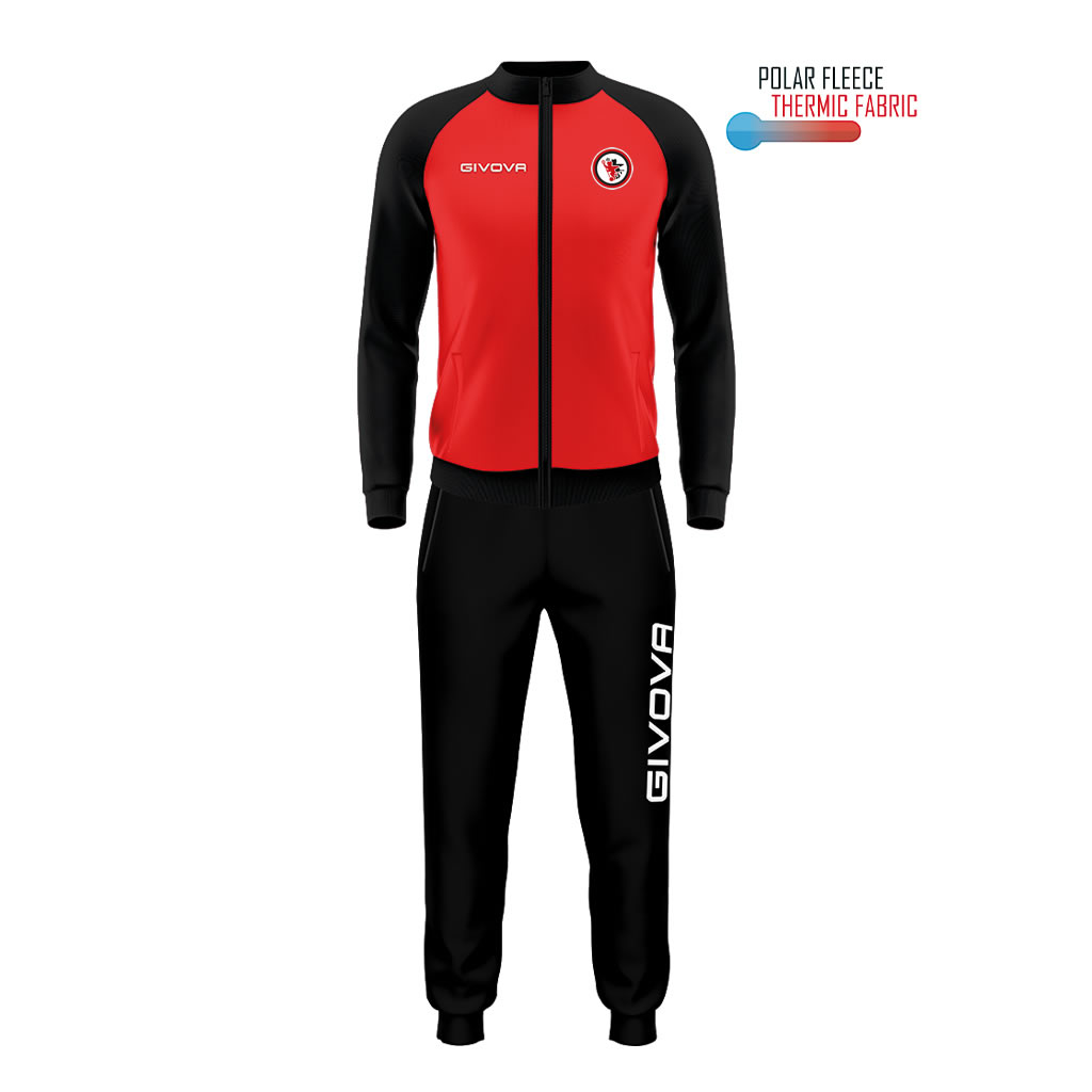 Tuta 100% Poliestere Triacetato 200 Gsm. Giacca: Zip intera; Loghi ricamati; Tasche laterali; Polsini in costina; Fondo giacca in costina; Pantaloni: Loghi ricamati; Tasche laterali; Fondo pantalone in costina;