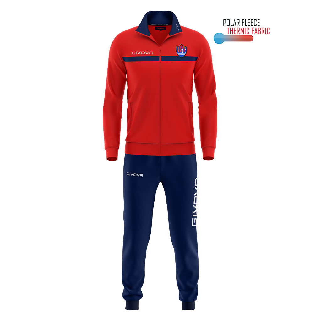 Giacca: Interno collo in costina; Loghi ricamati; Logo sul colletto; Tasche laterali; Polsini in costina; Fondo Giacca in costina; Pantaloni: Loghi ricamati; Tasche laterali; Fondo pantalone in costina; Zip nel fondo del pantalone;