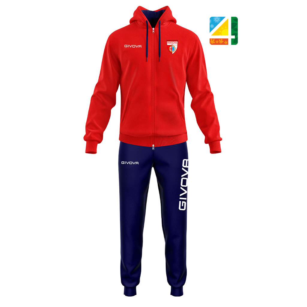 Giacca con Cappuccio: Zip Intera; Logo ricamato; Tasche laterali; Polsini in costina; Fondo Giacca in costina; Pantaloni: Loghi ricamati; Tasche laterali; Fondo pantalone in costina;