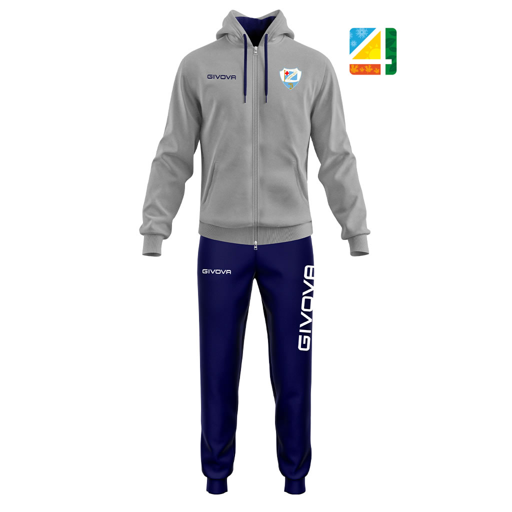 Tuta in Felpa 85% Poliestere – 15% Cotone Giacca con Cappuccio: Zip Intera; Logo Givova ricamato; Tasche laterali; Polsini in costina; Fondo Giacca in costina; Logo/patch del Team in transfer Pantaloni: Loghi ricamati; Tasche laterali; Fondo pantalone in costina; Logo/patch del Team in transfer Tessuto in felpa garzata adatto ai climi piรน freddi.