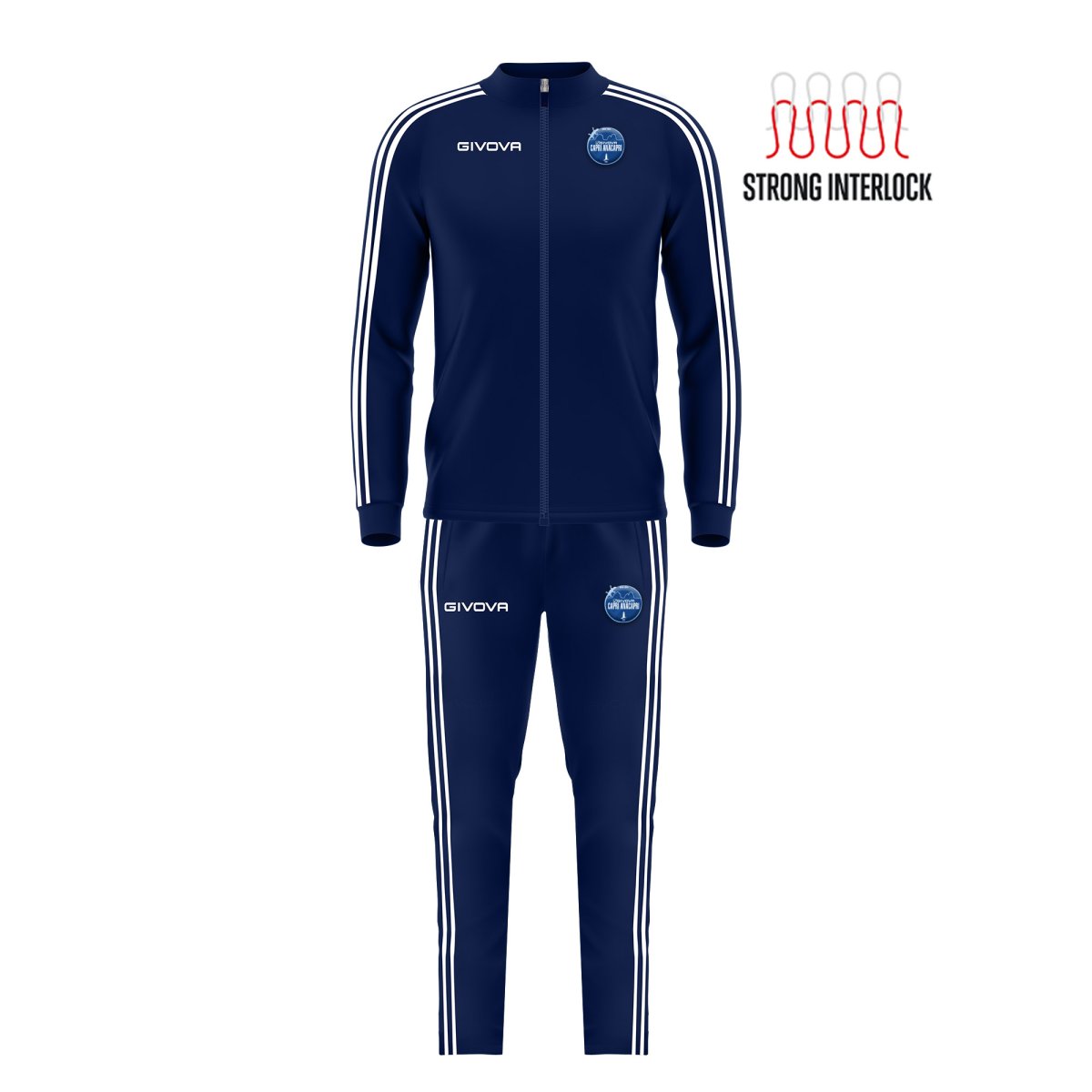 Tuta 100% Poliestere Interlock 202 Gsm. Giacca: Zip intera; Logo ricamato; Tasche laterali; Polsini in costina; Fondo giacca in costina; Bande laterali Cucite; Pantaloni: Logo ricamato; Tasche laterali; Zip nel fondo del pantalone; Bande laterali Cucite;
