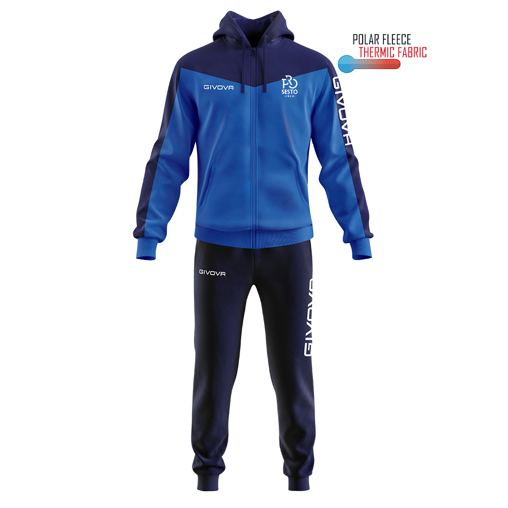 Tuta 100% Poliestere Polarfleece 230 Gsm. Giacca con Cappuccio Giacca con zip intera e cappuccio; Logo Givova ricamato; Logo AIA HD Tasche laterali; Polsini in costina. Pantaloni Logo Givova ricamato; Tasche laterali con chiusura a zip; Fondo pantalone in costina. Tessuto dalla massima tenuta termica con il minimo peso. La sua versatilitร  lo rende ideale per lโ€™allenamento e perfetto per il tempo libero.