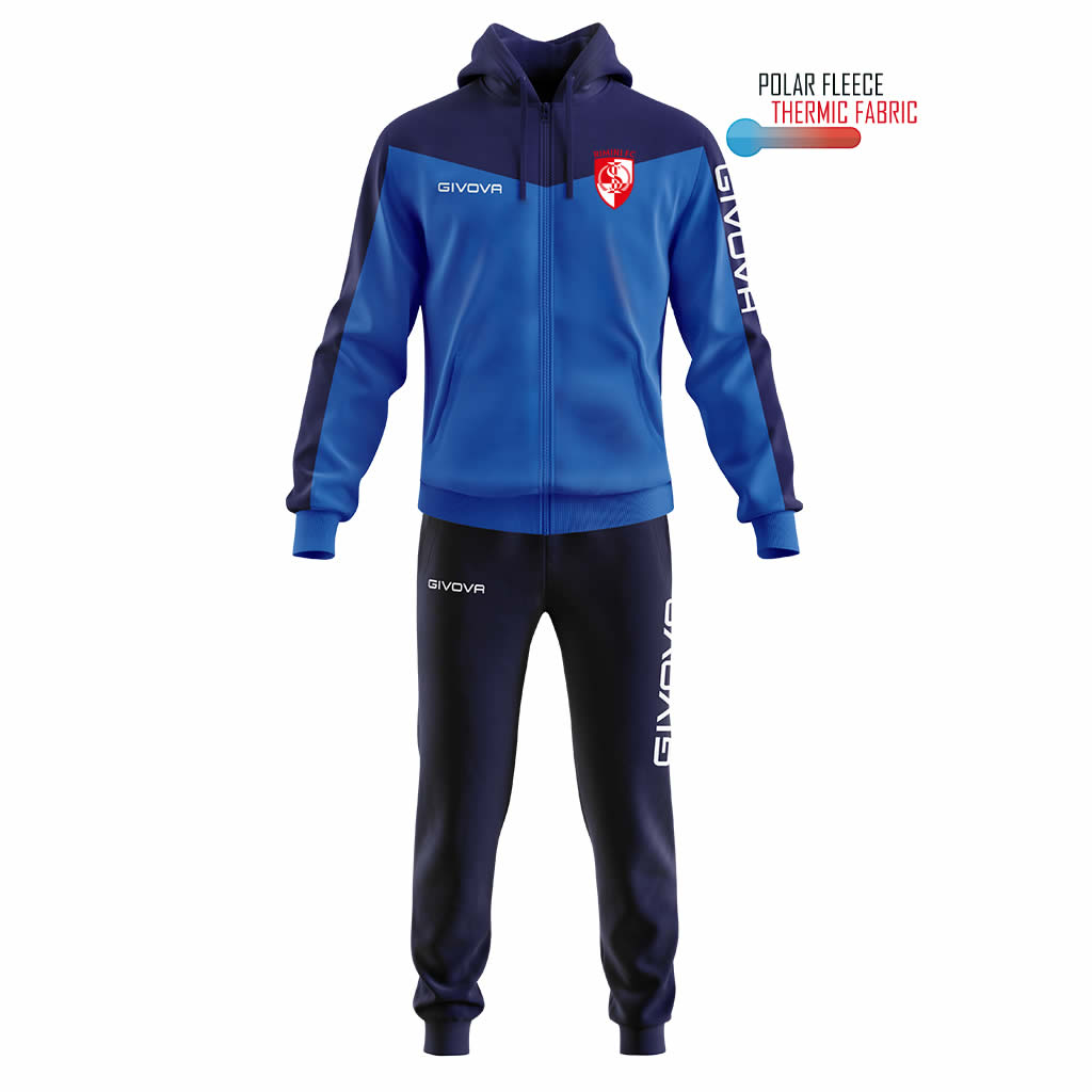 Tuta 100% Poliestere Polarfleece 230 Gsm. Giacca con Cappuccio Giacca con zip intera e cappuccio; Logo Givova ricamato; Logo AIA HD Tasche laterali; Polsini in costina. Pantaloni Logo Givova ricamato; Tasche laterali con chiusura a zip; Fondo pantalone in costina. Tessuto dalla massima tenuta termica con il minimo peso. La sua versatilitร lo rende ideale per lโallenamento e perfetto per il tempo libero.