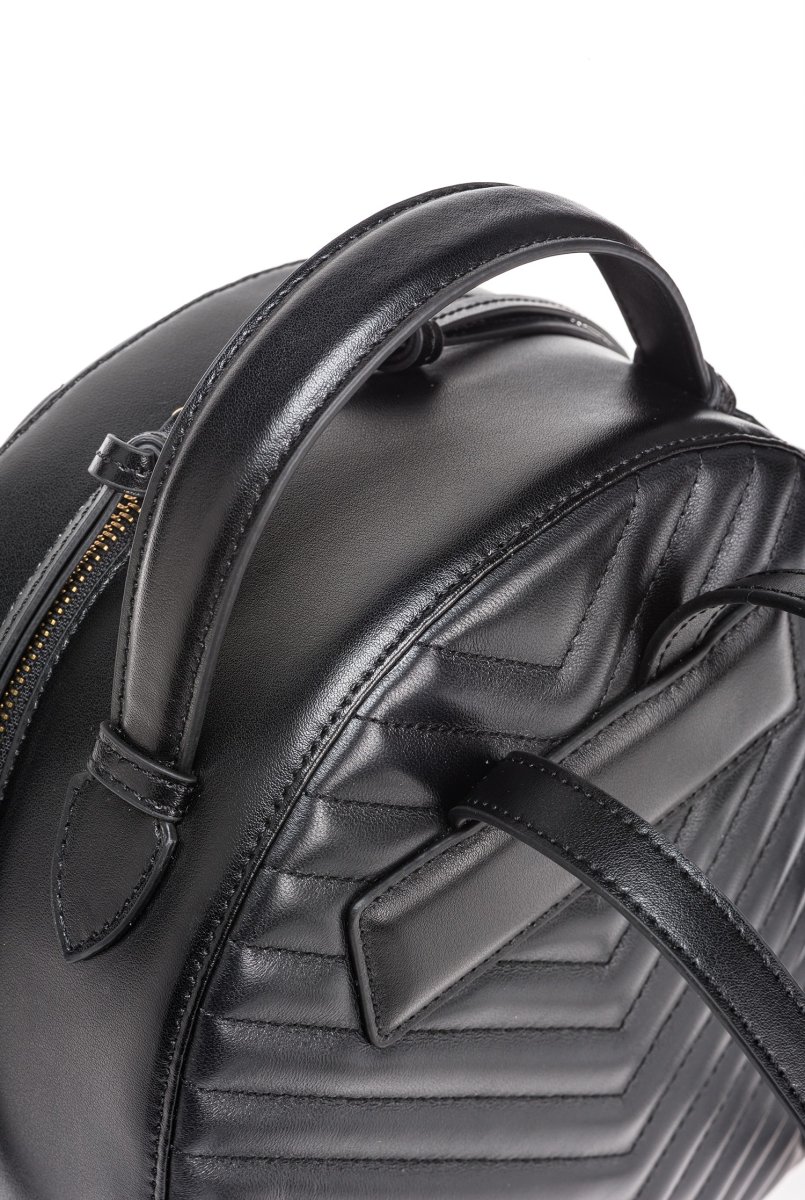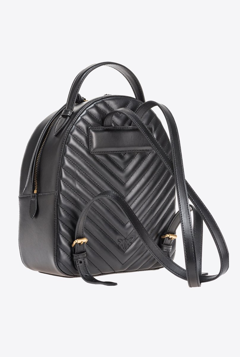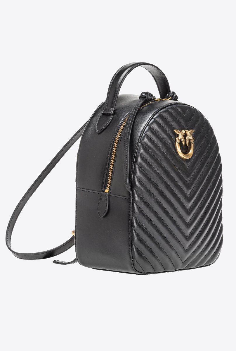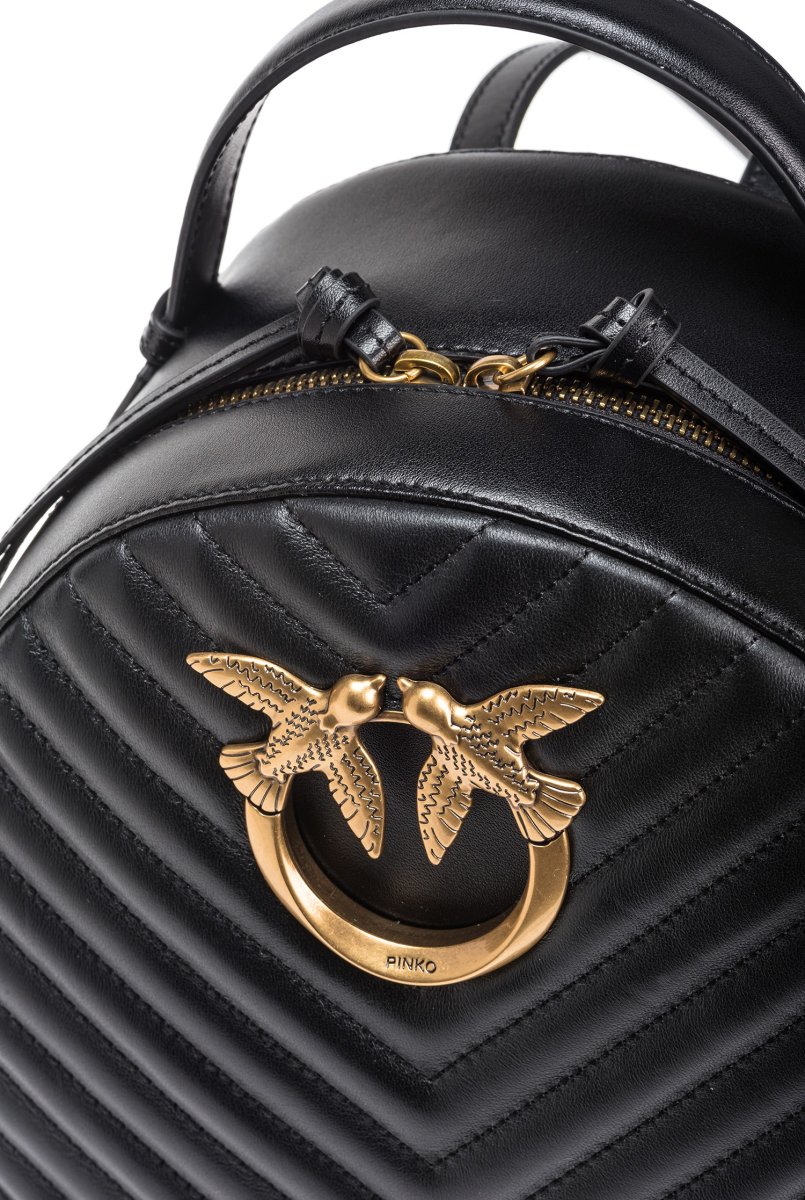 Zaino in pelle liscia e trapuntata con motivo chevron, personalizzato con fibbia Love Birds Diamond Cut davanti. Manico top handle e spalline regolabili in pelle. Chiusura con zip, doppio cursore.